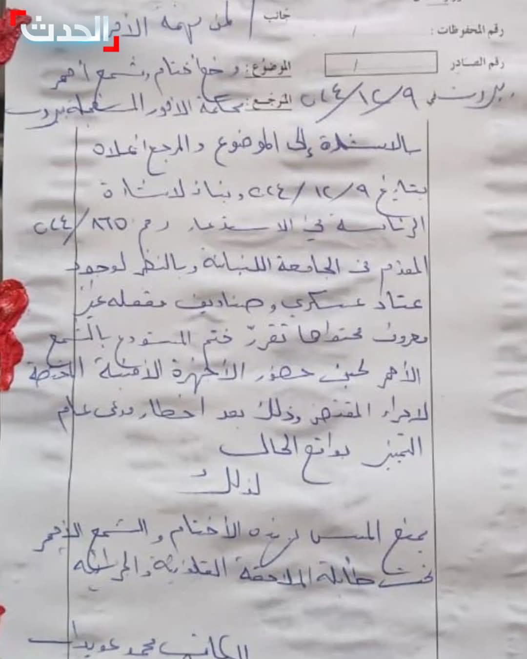 تداولت مواقع التواصل الاجتماعي وثيقة تكشف تخزين أسلحة وعتادا عسكريا وصناديق مقفلة غير معروف محتواها في مستودع داخل كلية الآداب والعلوم الإنسانية بالجامعة اللبنانية وتم ختمه بـ”الشمع الأحمر”