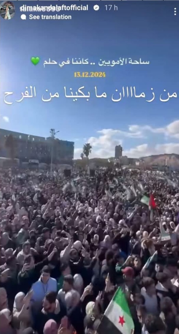 ونشرت ديما صورة عبر خاصية “الستوري” على حسابها الخاص على تطبيق انستغرام أظهرت الحشود في ساحة الأمويين في دمشق، وعلّقت عليها قائلة: “ساحة الأمويين كأننا في حلم. من زمااان مابكينا من الفرح “.