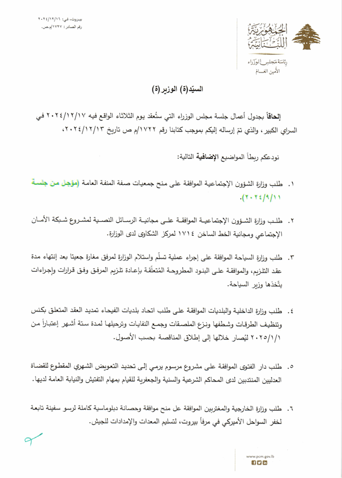 نشرت الأمانة العامة لمجلس الوزراء مواضيع إضافية سيتم بحثها خلال جلسة مجلس الوزراء المتوقع عقدها غدًا عند الساعة 3.30 من بعد ظهر يوم الثلاثاء 17/12/2024 في السرايا، لبحث سلسلة من المواضيع والبنود.