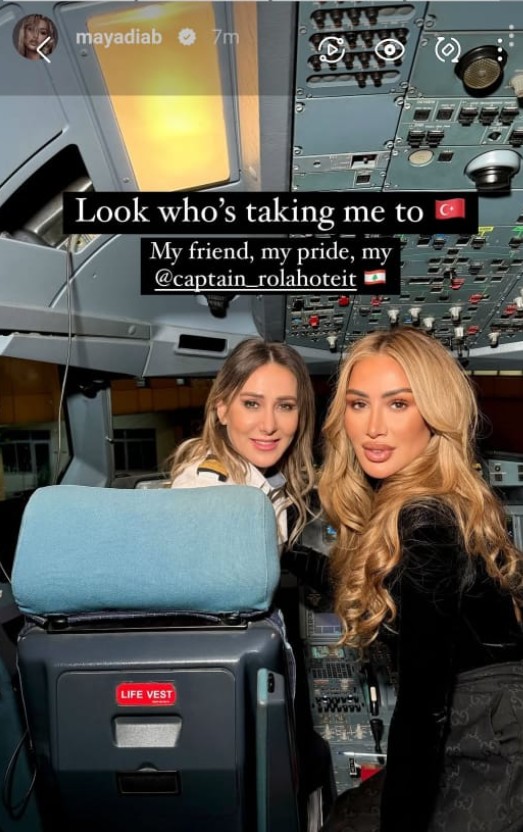 وأطلت مايا في الصورة من داخل قمرة القيادة لإحدى طائرات الميدل ايست برفقة الكابتن رولا حطيط.