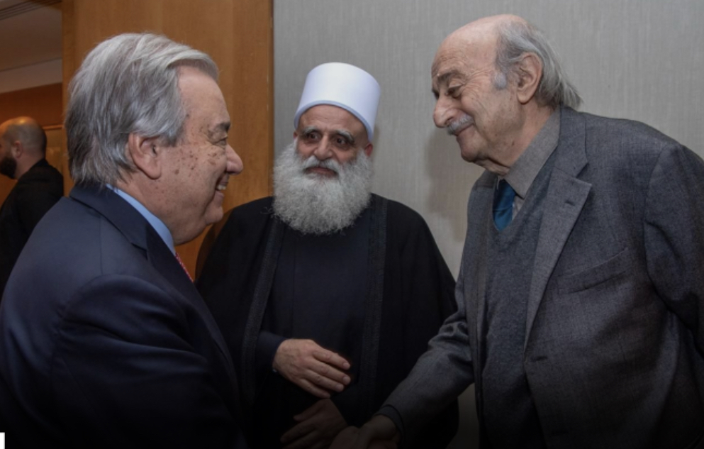 جمع لقاء مساء امس في بيروت، شيخ العقل لطائفة الموحدين الدروز الشيخ الدكتور سامي أبي المنى ورئيس الحزب التقدمي الاشتراكي السابق وليد جنبلاط، بالامين العام للأمم المتحدة أنطونيو غوتيريش، بحضور المنسّقة الخاصّة للأمم المتحدة في لبنان جينين هينيس بلاسخارت.