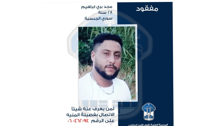 صـدر عـن المديريّـة العامّة لقوى الأمن الدّاخلي ـ شعبة العلاقـات العامّـة، البـلاغ التّالــي: “تُعمِّم المديريّة العامّة لقوى الأمن الدّاخلي بناءً على إشارة القضاء المختص صورة المفقود: مجد برّي الإبراهيم (مواليد عام 1997، سوري)، الذي غادر منزله الكائن في بحنّين – المنية إلى منطقة الدكوانة قرابة السّاعة 05.00 من فجر تاريخ 17/1/2025، ولم يَعُد لغاية تاريخه.