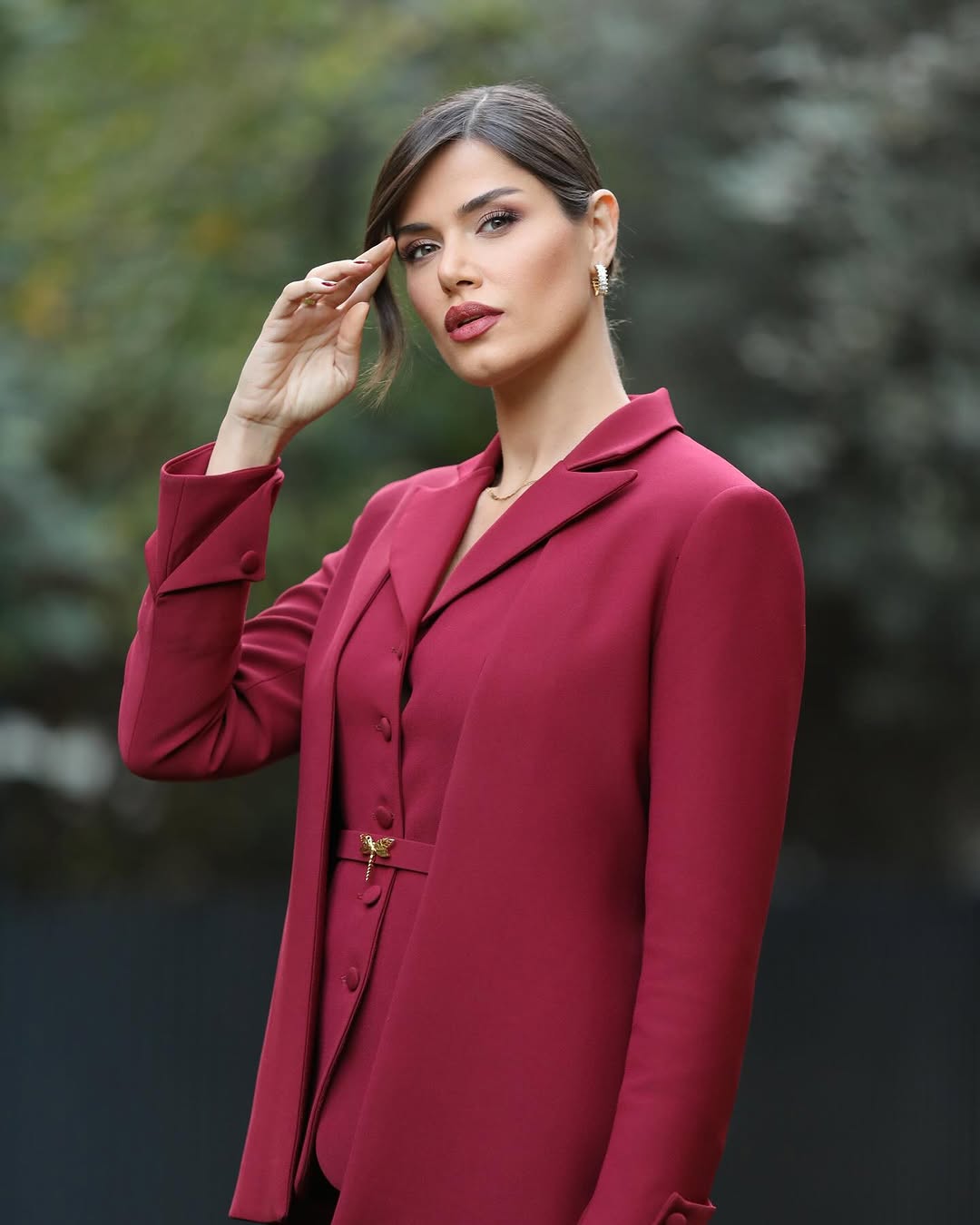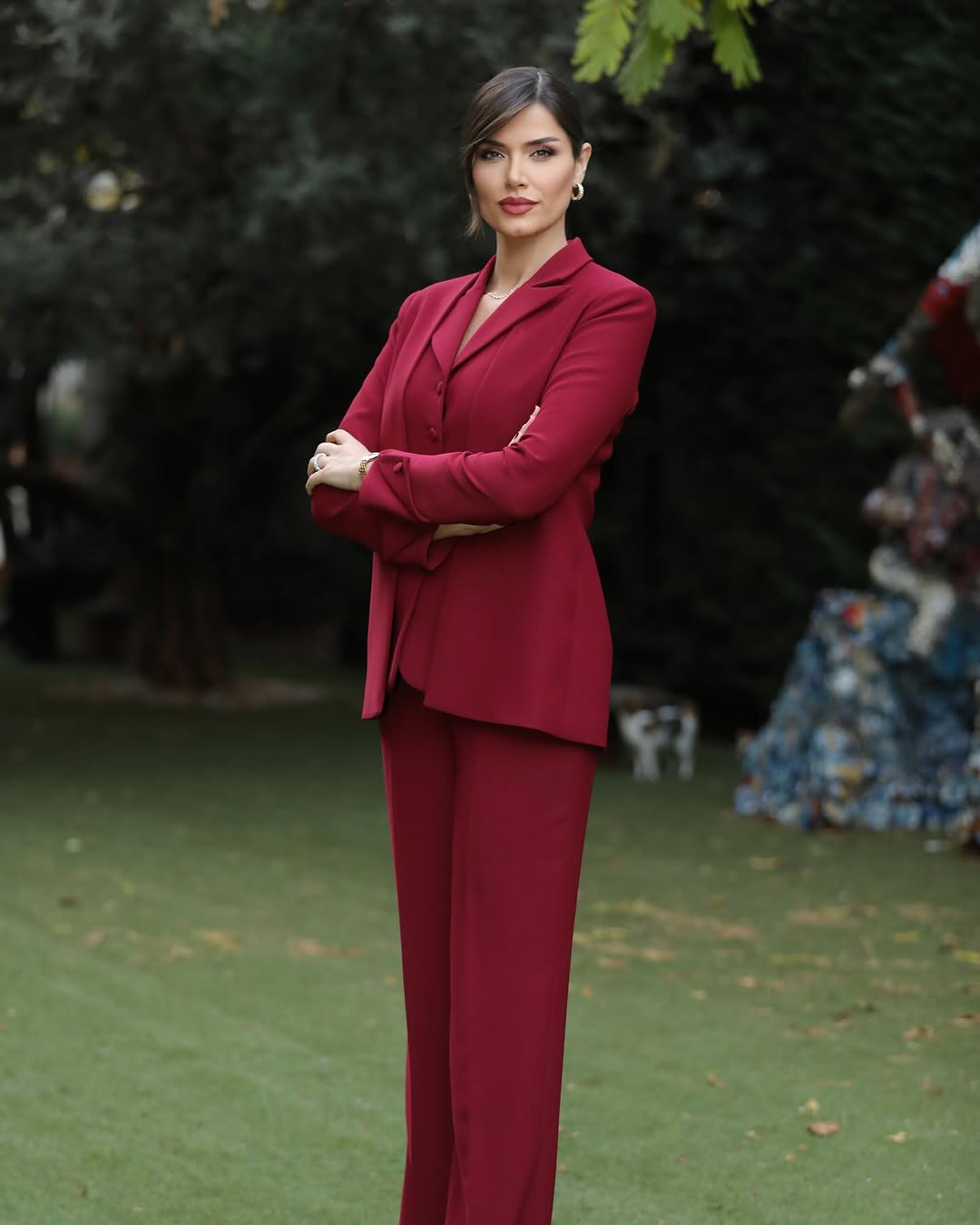 وأطلت نبيلة بإطلالة أنيقة حيث اختارت بدلة نسائية باللون الأحمر النبيذي.