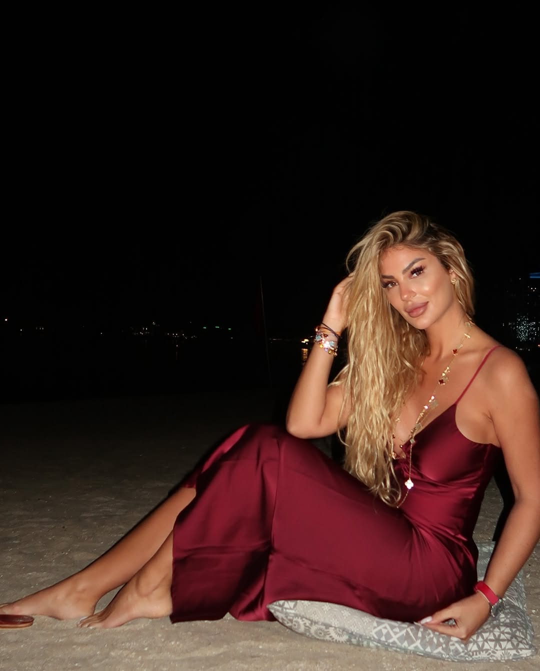 وأطلت ساندرا في الصور بفستان من الساتان باللون النبيذي وهي تستمتع بوقتها ليلا على أحد شواطئ مدينة دبي.