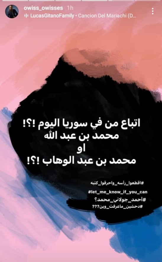 وكتب أويس قائلا: “اتباع من في سوريا اليوم؟؟ محمد بن عبدالله او محمد بن عبد الوهاب”” وأرفقه بهاشتاغ #اقطعوا رأسه واحرقوا كتبه، #أحمد جولاني محمد؟