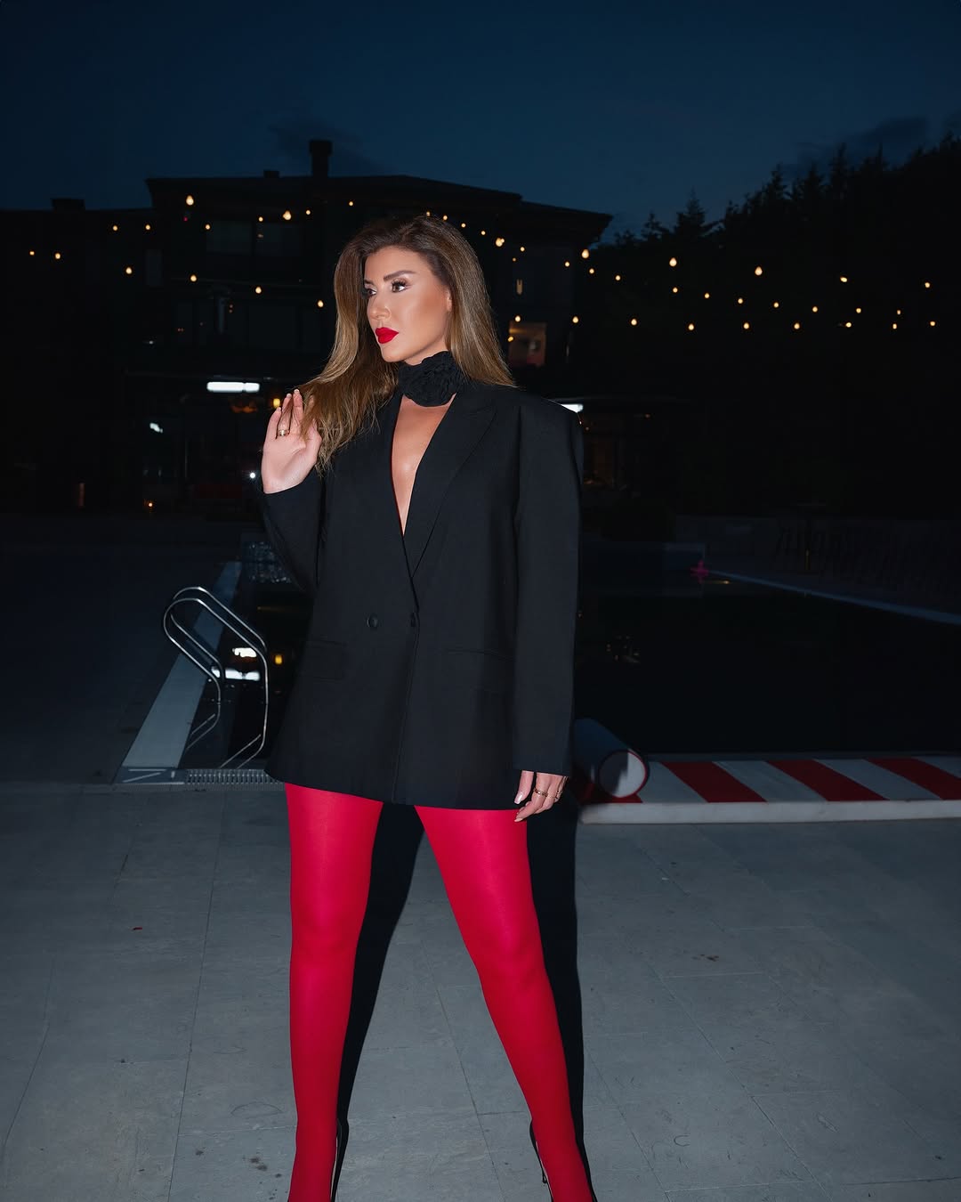 وأطلت ريتا في جلسة تصزير بمناسبة عيد الحب بإطلالة جريئة، حيث ارتدت جاكيت بلايز باللون الأسود فقط مع جوارب باللون الأحمر.