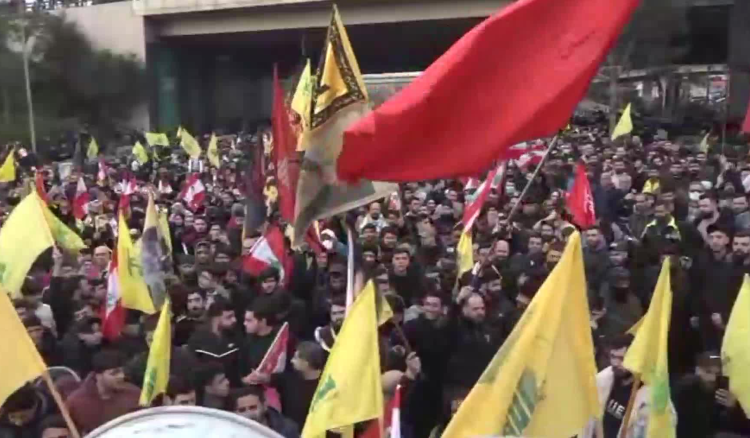 وحمل المشاركون الذين أكدوا ان اعتصامهم سلمي، العلم اللبناني ورايات حزب الله وصور السيد الشهيد حسن نصر الله، ورددوا هتافات نددت بالتدخل الاسرائيلي الاميركي وشعارات “اميركا ام الارهاب” و”الموت لاميركا”.