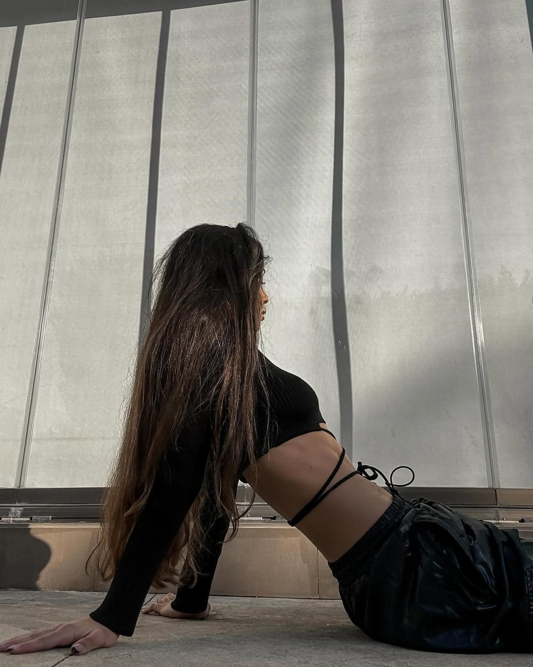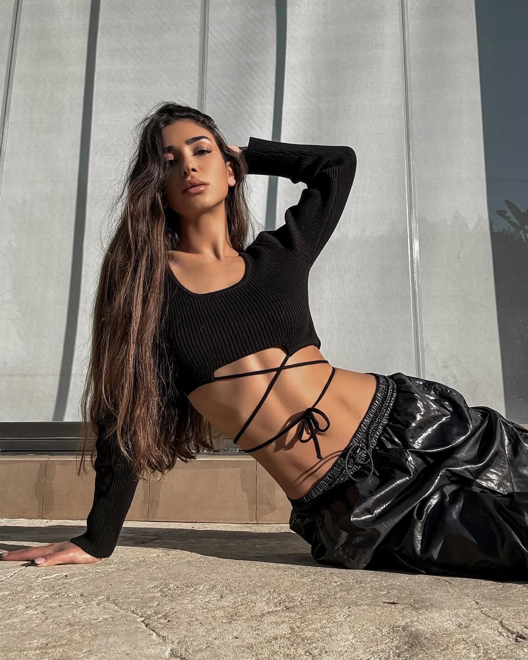 وارتدت تيا “كروب توب” مفتوحا باللون الأسود وضعت فوقه جاكيت قصيرة باللون نفسه مع بنطال واسع باللون الفضي.
