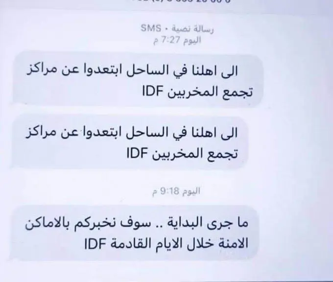 وجاء في إحدى الرسائل: “إلى أهلنا في الساحل، ابتعدوا عن مراكز تجمع المخربين IDF”، فيما تضمن نص آخر تهديدًا ضمنيًا: “ما جرى البداية.. سوف نخبركم بالأماكن الآمنة خلال الأيام القادمة IDF”.