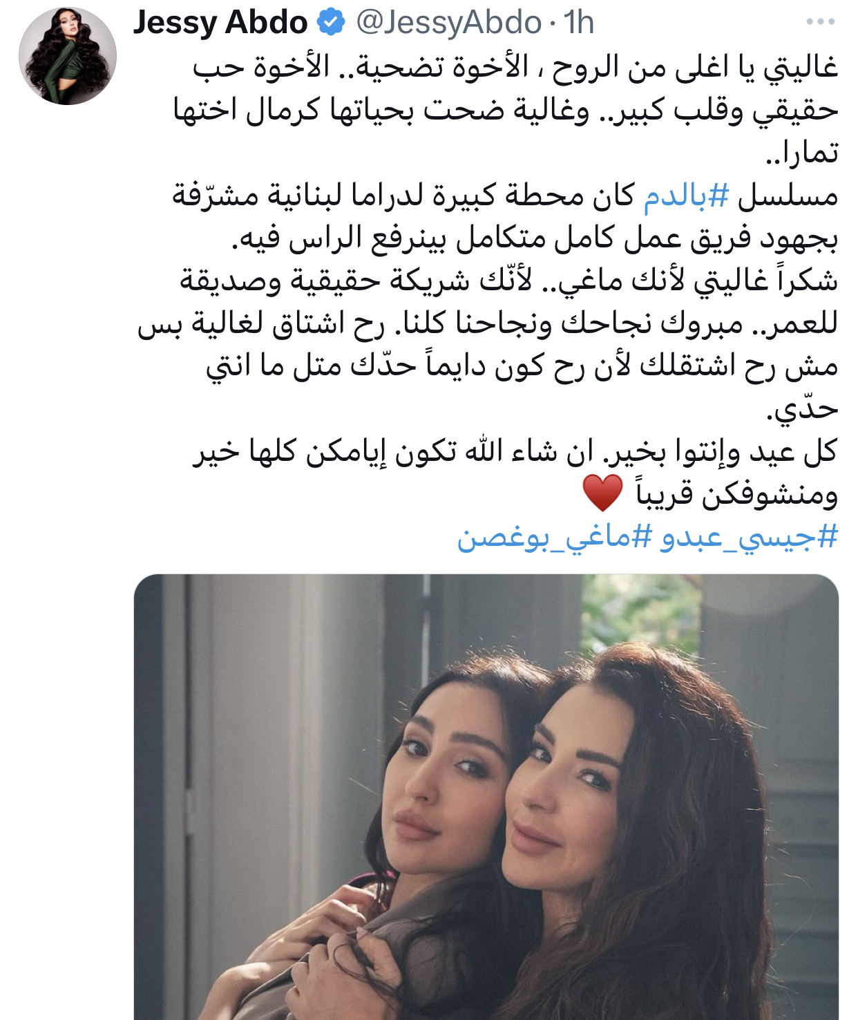 نشرت الممثلة جيسي عبدو، صورة عبر حسابها على “انستغرام” تجمعها بزميلتها في مسلسل “بالدم” ماغي بو غصن.