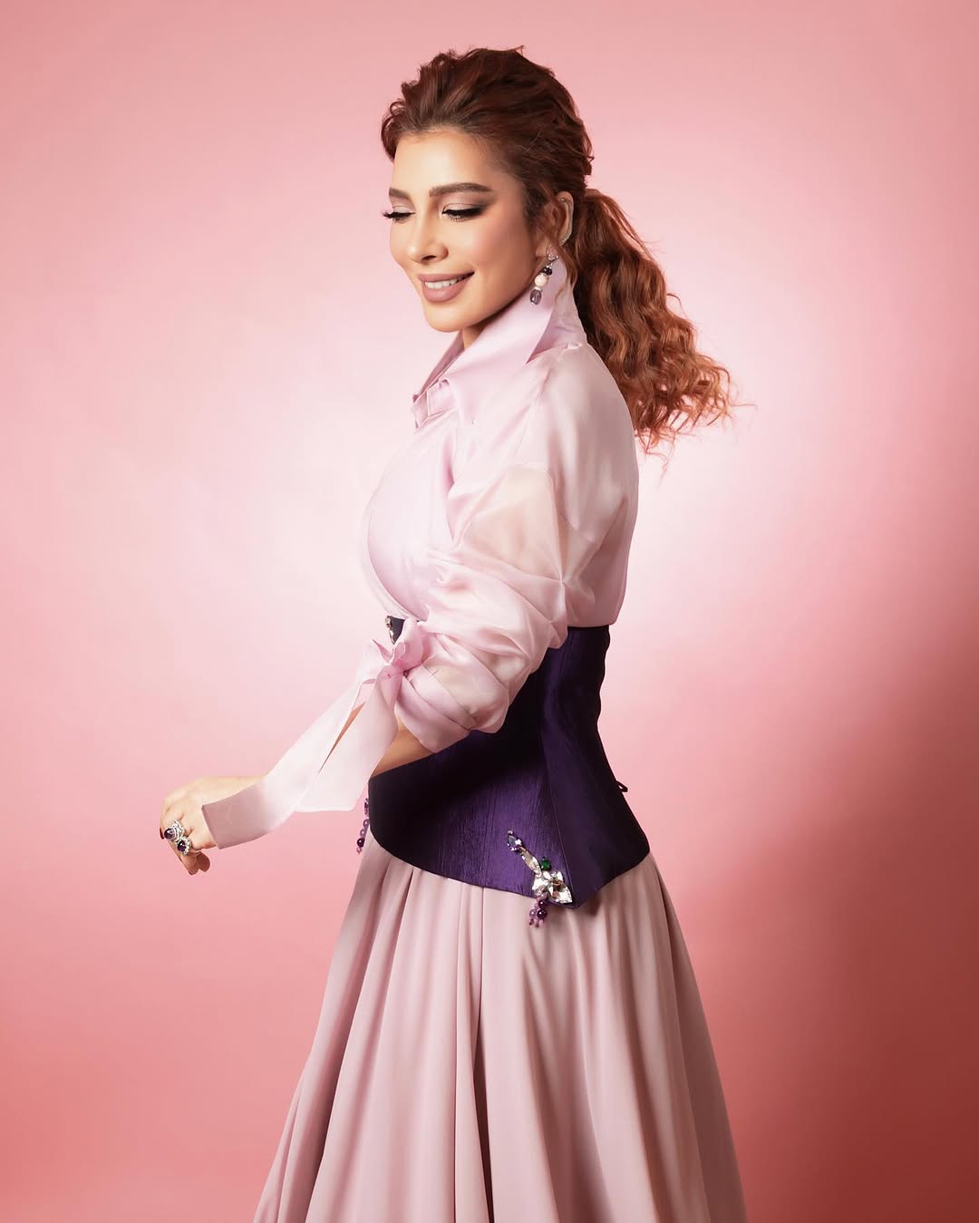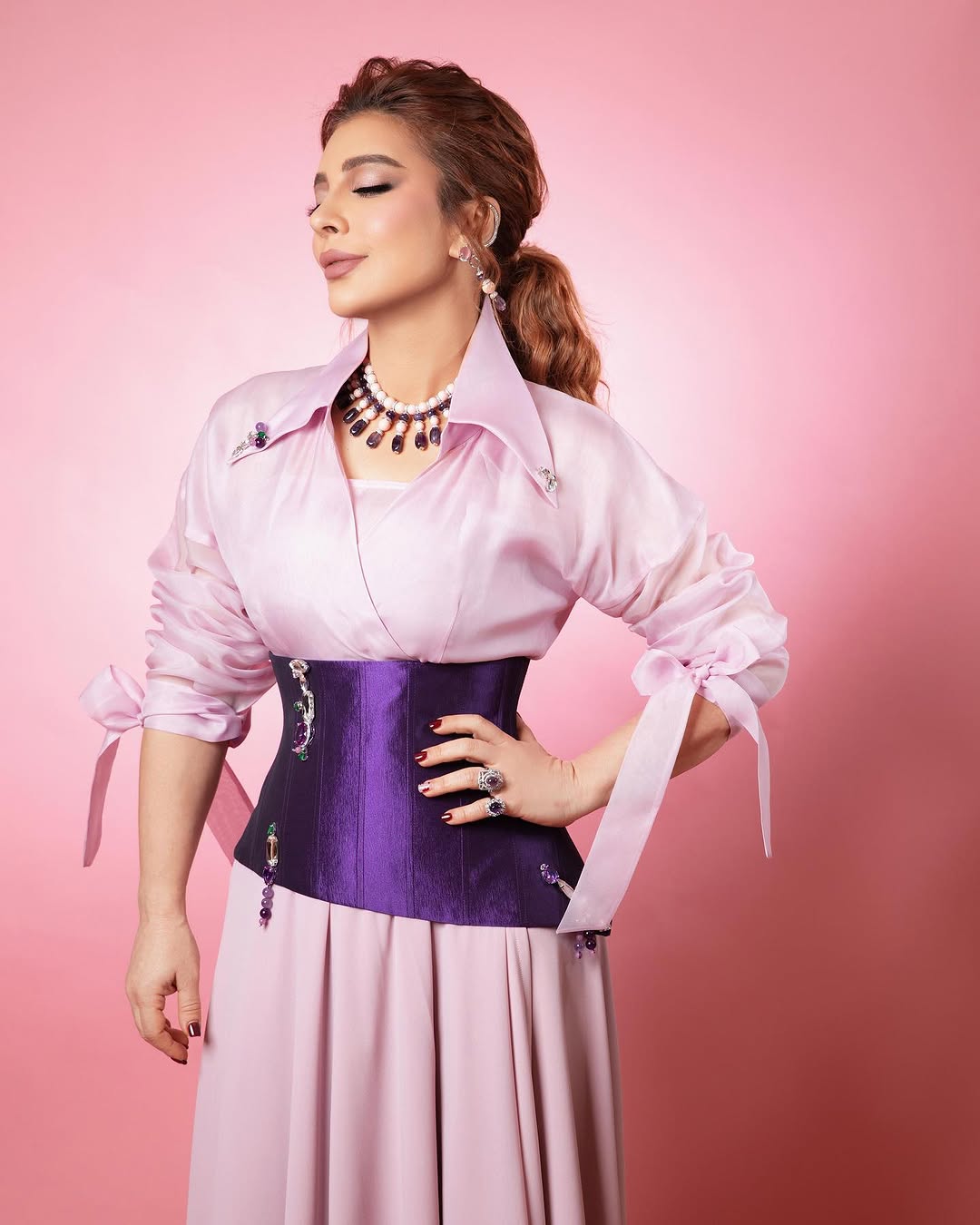 لتكمل أصالة إطلالتها المتكاملة، اختارت عقدًا وأقراطًا بارزة بأحجار كبيرة باللونين الأبيض والبنفسجي، وهو تنسيق مذهل مع الفستان. تلك الأحجار أضافت لمسة جمالية مشرقة، وأظهرت براعة أصالة في اختيار الإكسسوارات التي تتناغم مع ملابسها.