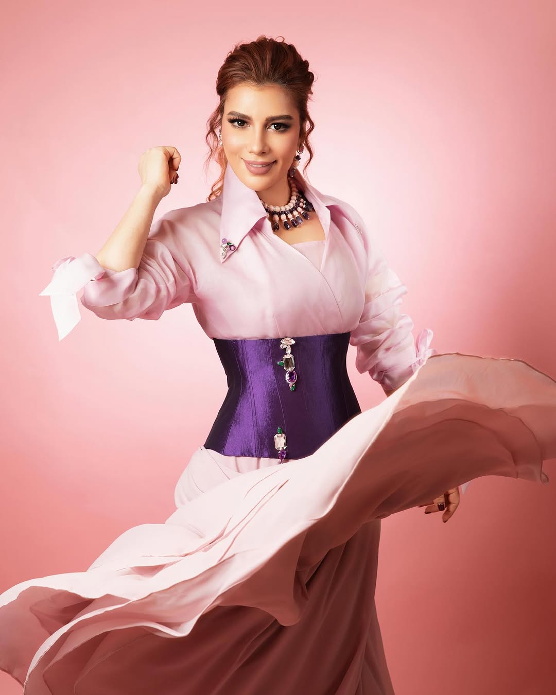 لكن أبرز ما في الفستان كان الحزام العريض باللون البنفسجي، الذي جاء مصنوعًا من الساتان بتصميم مستوحى من قصة الكورسيه. هذا الحزام، الذي يزينه العديد من الأحجار الكريستالية والأحجار الملونة، جعل من الإطلالة أكثر تميزًا وأضفى على فستان أصالة لمسة من الفخامة والأنوثة.