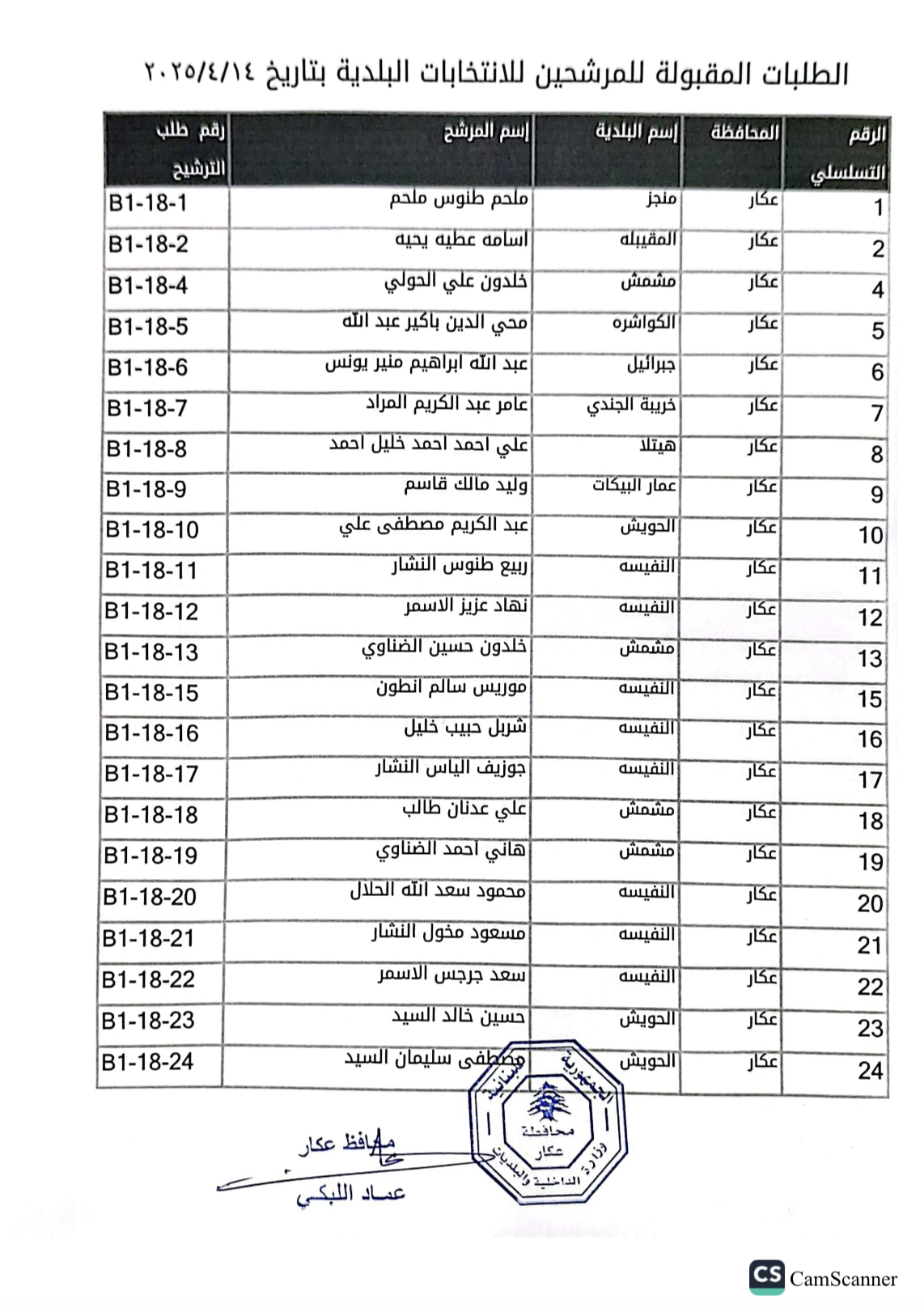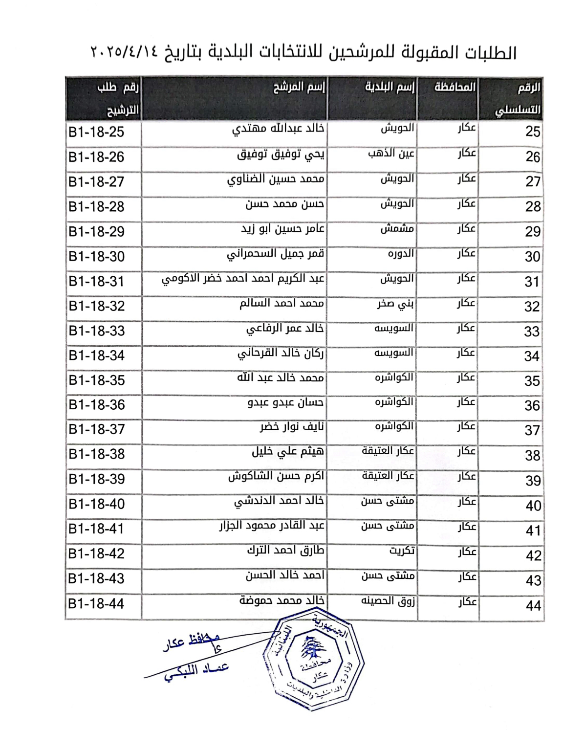 15APR بالأسماء المرشحون للانتخابات البلدية في عكار لغاية 14 نيسان Share Tweet Share Whatsapp Email تضمنت لائحة المرشحين للانتخابات البلدية عن قرى قضاء عكار، 44 مرشحاً لغاية 14 نيسان 2025، وهذه أسماؤهم: Related Postsزيارة سلام إلى طرابلس وعكار ردة فعل إرتجالية أم جائزة ترضية؟!.. نجلة حمودصندوق الزكاة في عكار.. شفافية مالية تزرع بذور الأمل في قلوب المحتاجين!.. نجلة حمودفي ثلاث محافظات.. قرارات جديدة من وزير الداخلية بشأن الانتخابات البلدية والاختياريةمشمش تتألق بمبادرات مغتربيها ودعمهم للتوافق البلدي.. نجلة حمود Post Author: SafirAlChamal