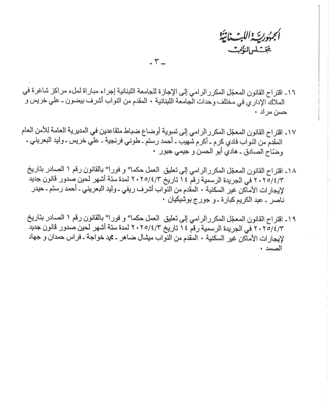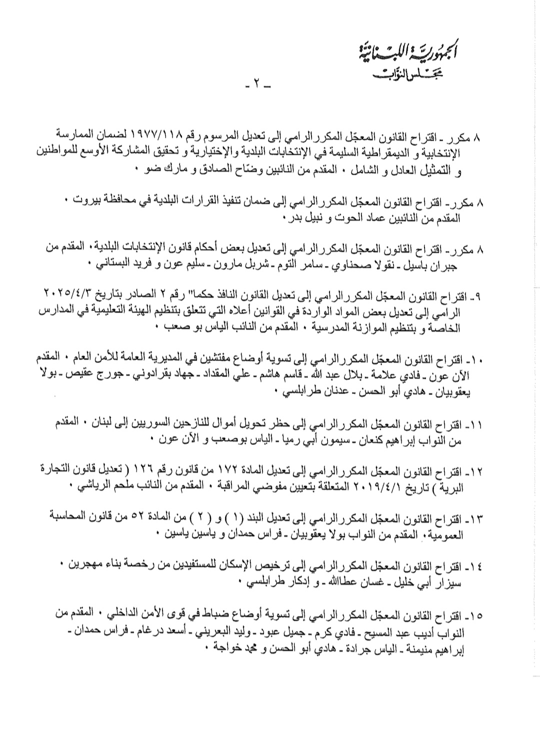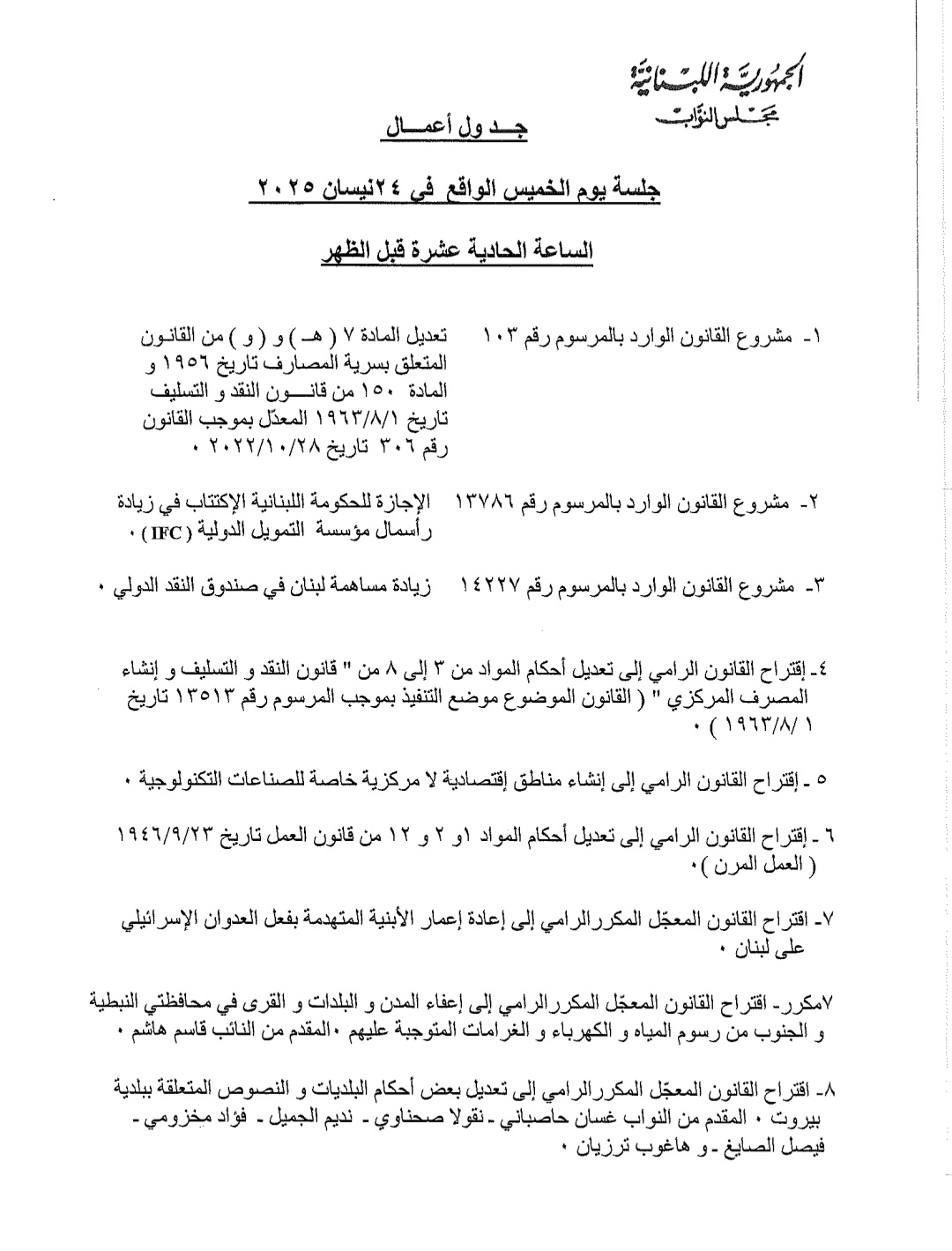 دعا رئيس مجلس النواب نبيه بري، الى جلسة تعقد في تمام الحادية عشرة من قبل ظهر يوم غد الخميس، وذلك لدرس مشاريع اقتراحات القوانين المدرجة على جدول الأعمال وإقرارها.