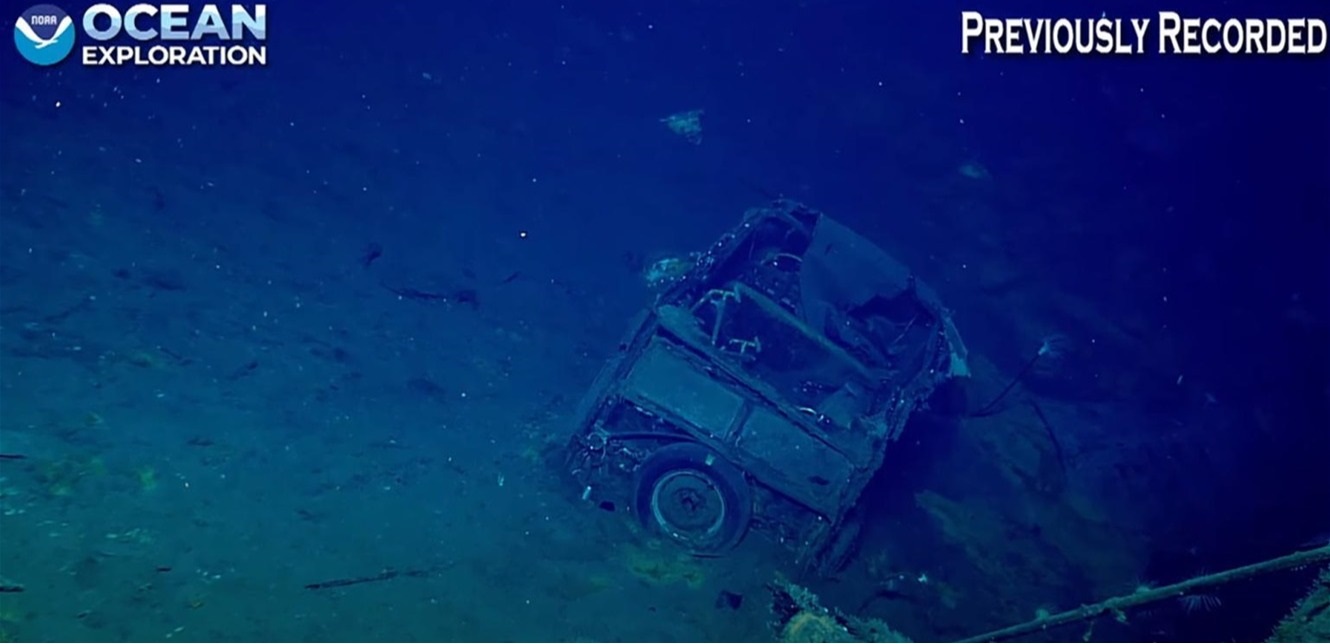 رصد فريق استكشاف سيارة سوداء قديمة وسط حطام حاملة الطائرات الأميركية “يو إس إس يوركتاون” التي غرقت عام 1942 خلال معركة ميدواي الشهيرة.