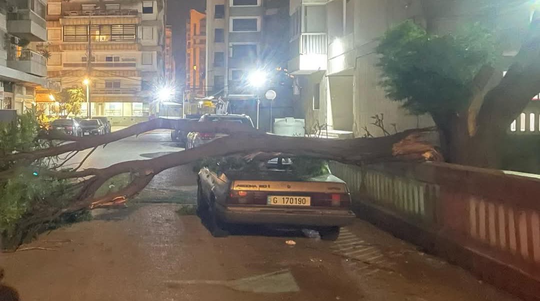 تسببت الرياح القوية التي تشهدها مدينة طرابلس بسقوط شجرة على إحدى السيارات أثناء مرورها على طريق المعرض، ما أدى إلى أضرار مادية في هيكل السيارة.