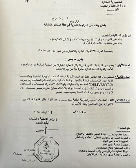 أصدر وزير الداخلية والبلديات أحمد الحجار، قراراً بشأن وقف سير الدراجات النارية في كافة المناطق اللبنانية، بمناسبة إجراء الإنتخابات البلدية والإختيارية.