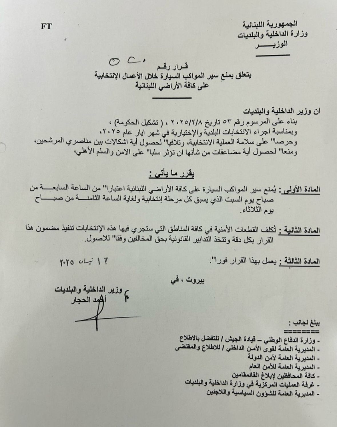 قرار صادر عن وزير الداخلية والبلديات أحمد الحجار بمنع سير المواكب السيارة خلال الأعمال الإنتخابية على كافة الأراضي اللبنانية