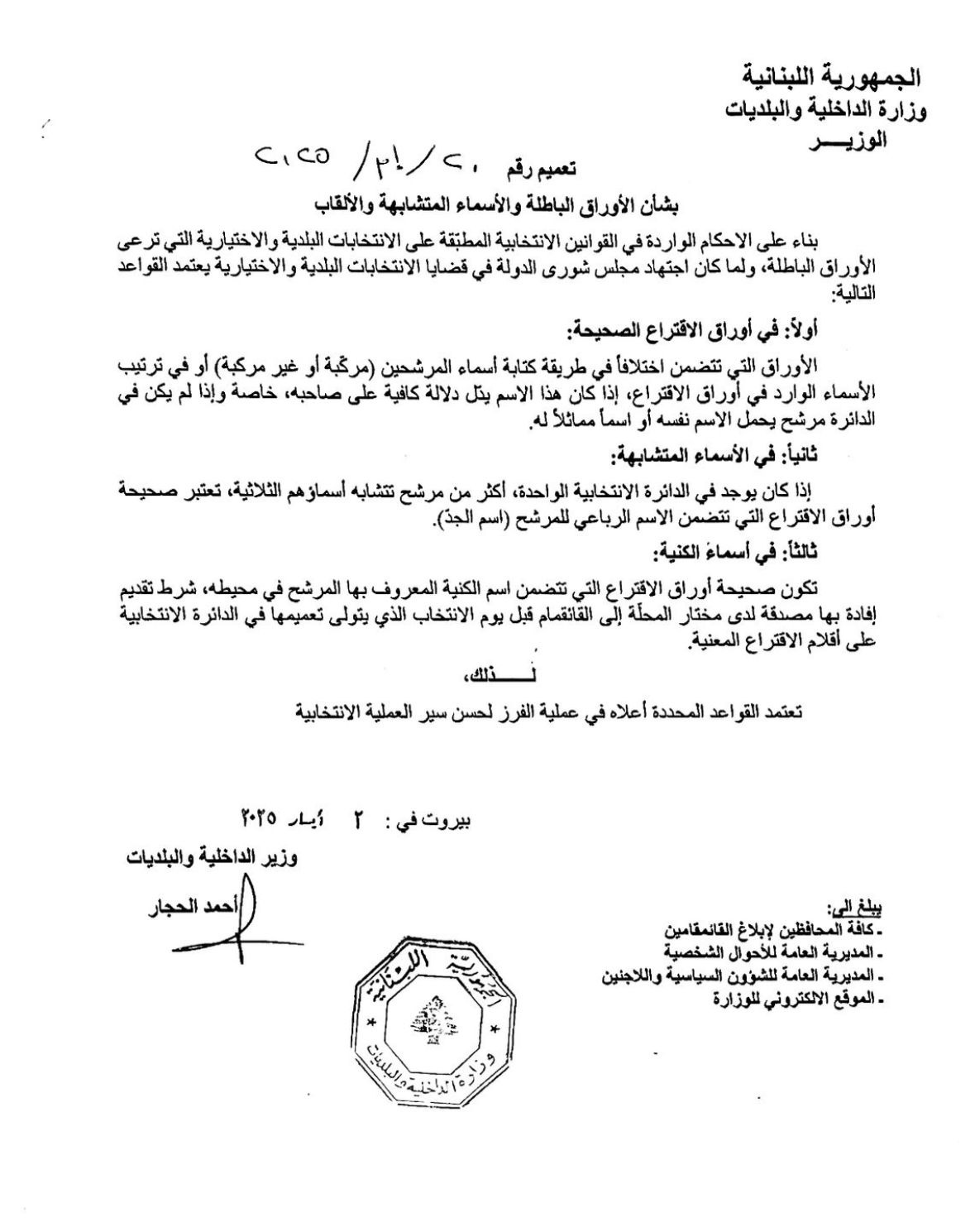 02MAY تعميم جديد من وزير الداخلية Share Tweet Share Whatsapp Email صدر عن وزير الداخلية والبلديات أحمد الحجار تعميم بشأن الاوراق الباطلة والاسماء المتشابهة والألقاب. Related Postsالحق في الضمان الإجتماعي بين الضمير والتشريع!!.. بقلم: د. رنا الجملغارة إسرائيلية على سورياكم بلغ عدد المرشحين والمرشحات في جبل لبنان؟ Post Author: SafirAlChamal