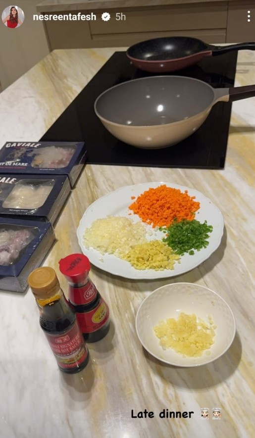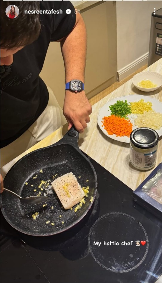 ووثقت نسرين من خلال الصور الأوقات السعيدة التي تقضيها مع زوجها رجل الأعمال المصري أحمد جوهر حيث بدا وهو يحضر طعام العشاء.