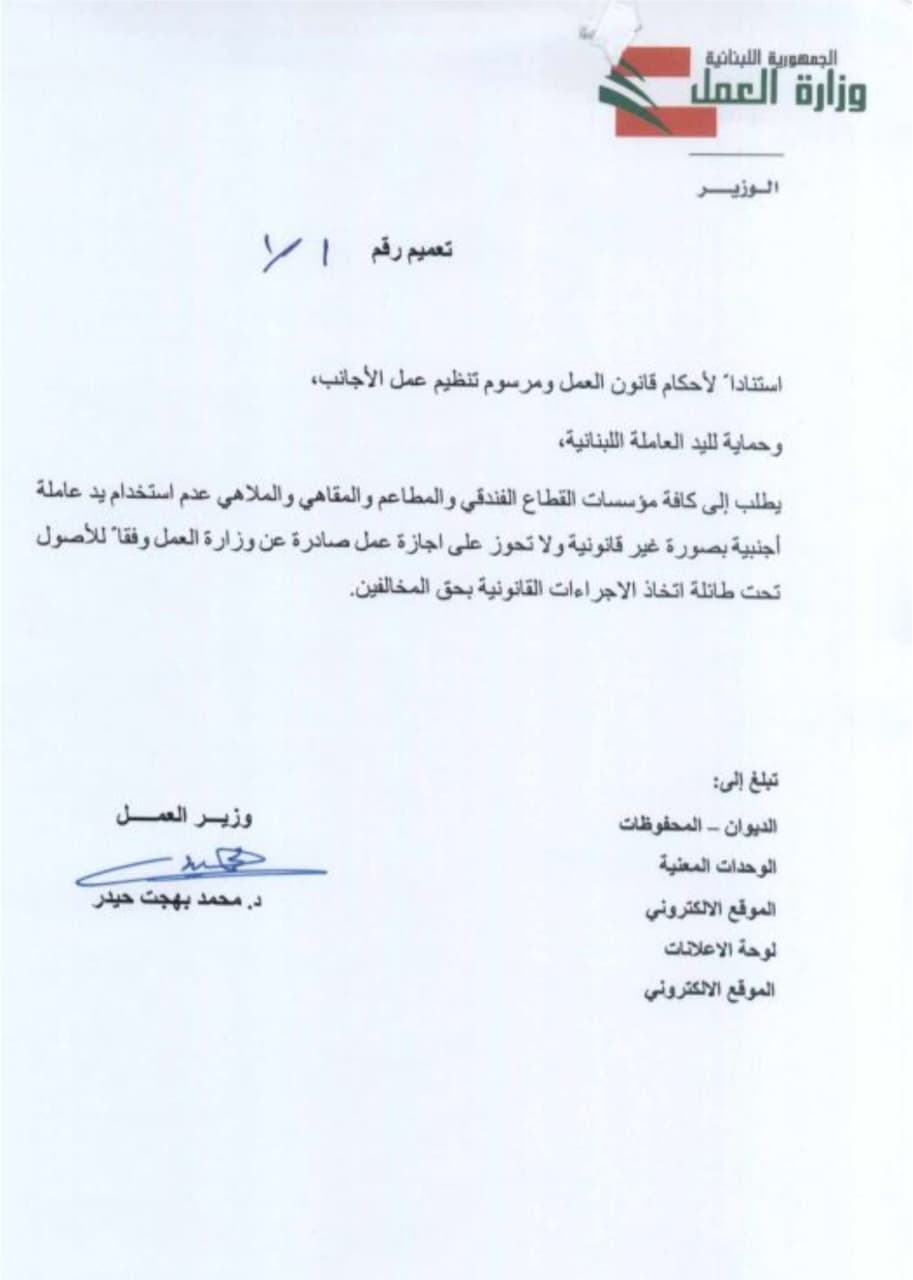 أصدر وزير العمل محمد حيدر، تعميماً جديداً، طلب فيه من كافة مؤسسات القطاع الفندقي والمطاعم والمقاهي والملاهي عدم استخدام يد عاملة أجنبية بصورة غير قانونية ولا تحوز على إجازة عمل صادرة عن وزارة العمل وفقاً للأصول تحت طائلة اتخاذ الإجراءات القانونية بحق المُخالفين.