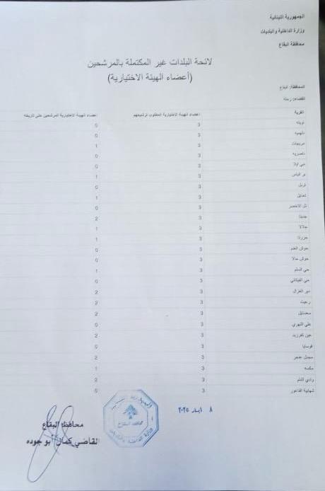 صدر عن محافظ البقاع القاضي كمال ابو جوده قرارًا حمل رقم (1/ه.ت) يتعلق بتمديد فترة قبول الترشيح لاعضاء الهيئة الاختيارية في البلدات غير المكتملة في قضاء زحلة، وذلك بناء على المادة رقم 5 من قانون المختارين والمجالس الاختيارية الصادر عام 1947 معطوفة على المادة 26 من القانون رقم 97/665 التي تجيز قبول ترشيحات جديدة تقدم قبل الاقتراع بثلاثة ايام.