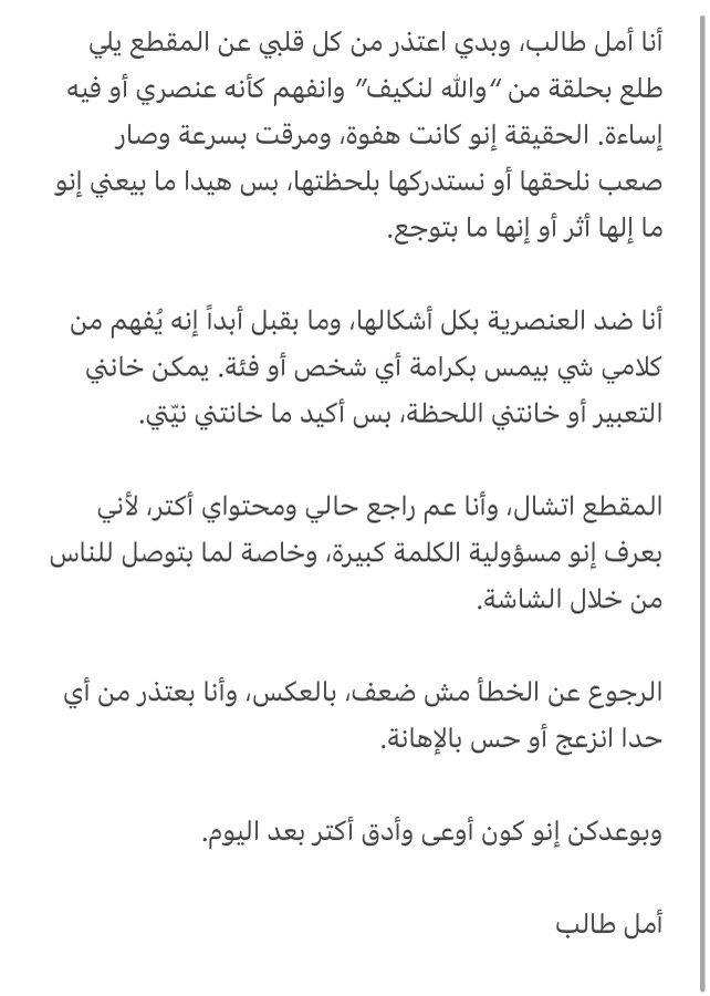 وكتبت طالب عبر حسايها على “إكس” قائلة: “أنا أمل طالب، وبدي اعتذر من كل قلبي عن المقطع يلي طلع بحلقة من “والله لنكيف” وانفهم كأنه عنصري أو فيه إساءة. الحقيقة إنو كانت هفوة، ومرقت بسرعة وصار صعب نلحقها أو نستدركها بلحظتها، بس هيدا ما بيعني إنو ما إلها أثر أو إنها ما بتوجع.”