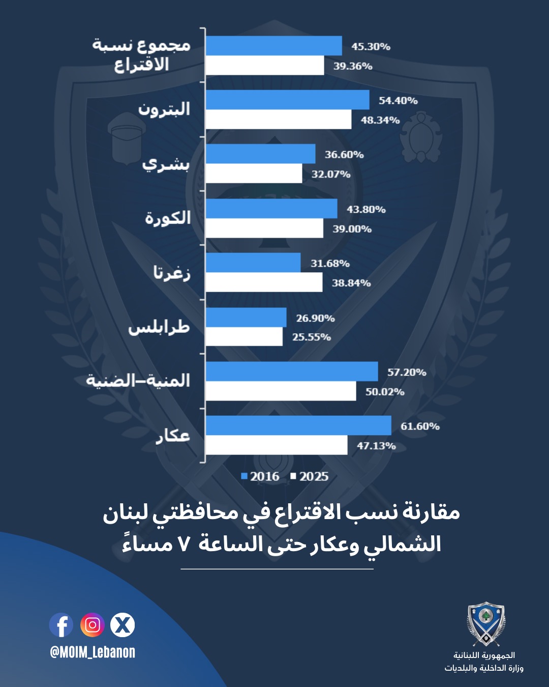 نشرت وزارة الداخلية والبلديات رسماً بيانياً يُظهر المقارنة في الاقتراع خلال الانتخابات البلدية والاختيارية عام 2016 والعام الحالي في محافظتي لبنان الشمالي وعكار.