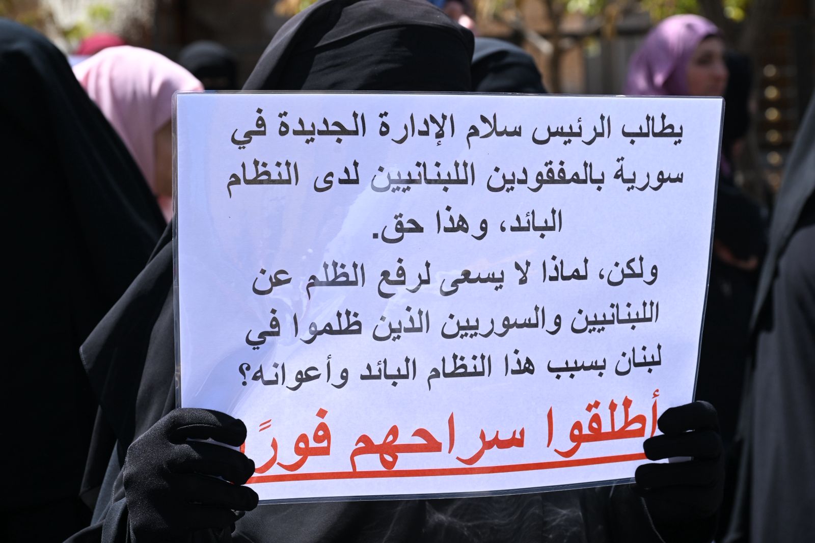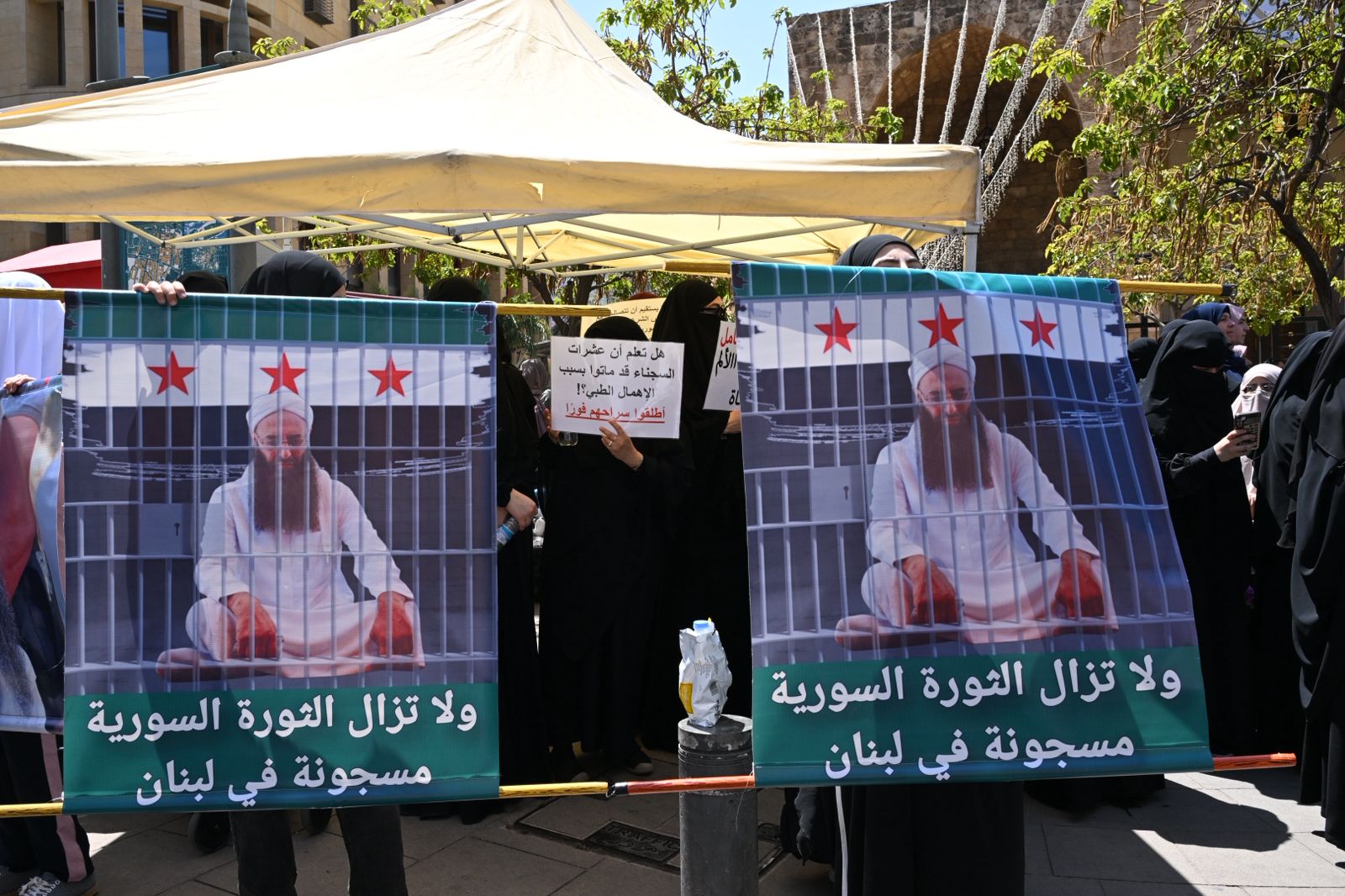 وقد حمل المعتصمون لافتات عليها صورة أحمد الأسير وكتب تحتها “ولا تزال الثورة السورية مسجونة في لبنان”.