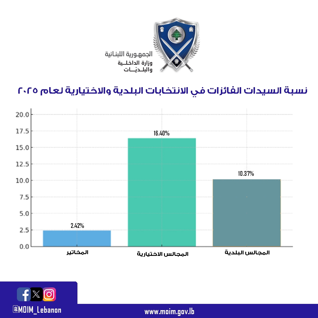 نشرت وزارة الداخلية والبلديات نسبة السيدات الفائزات في الانتخابات البلدية والاختيارية لعام 2025.