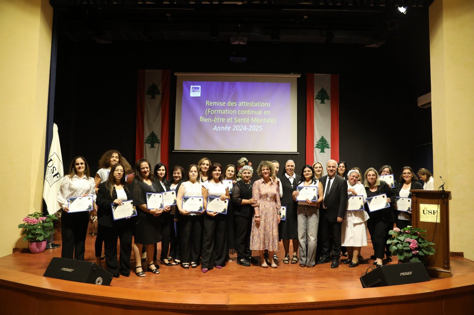 وفي الختام، جرى توزيع إفادات مشاركة لعدد من المعلمات من مدارس تابعة للجمعيّة اللّواتي شاركن خلال العام الحالي في دورات تدريبيّة حول الصحّة النفسيّة. كما كان هناك حصّة للمرّضات والممرّضين، من القدامى، الّذين أولتهم الجامعة اهتمامًا خاصًّا عبر تنظيم برنامج تدريب حول الصحّة النفسيّة، وذلك في إطار احتفالات اليوبيل الفضّي (25 سنة) على نيلهم شهادة العلوم التمريضية.