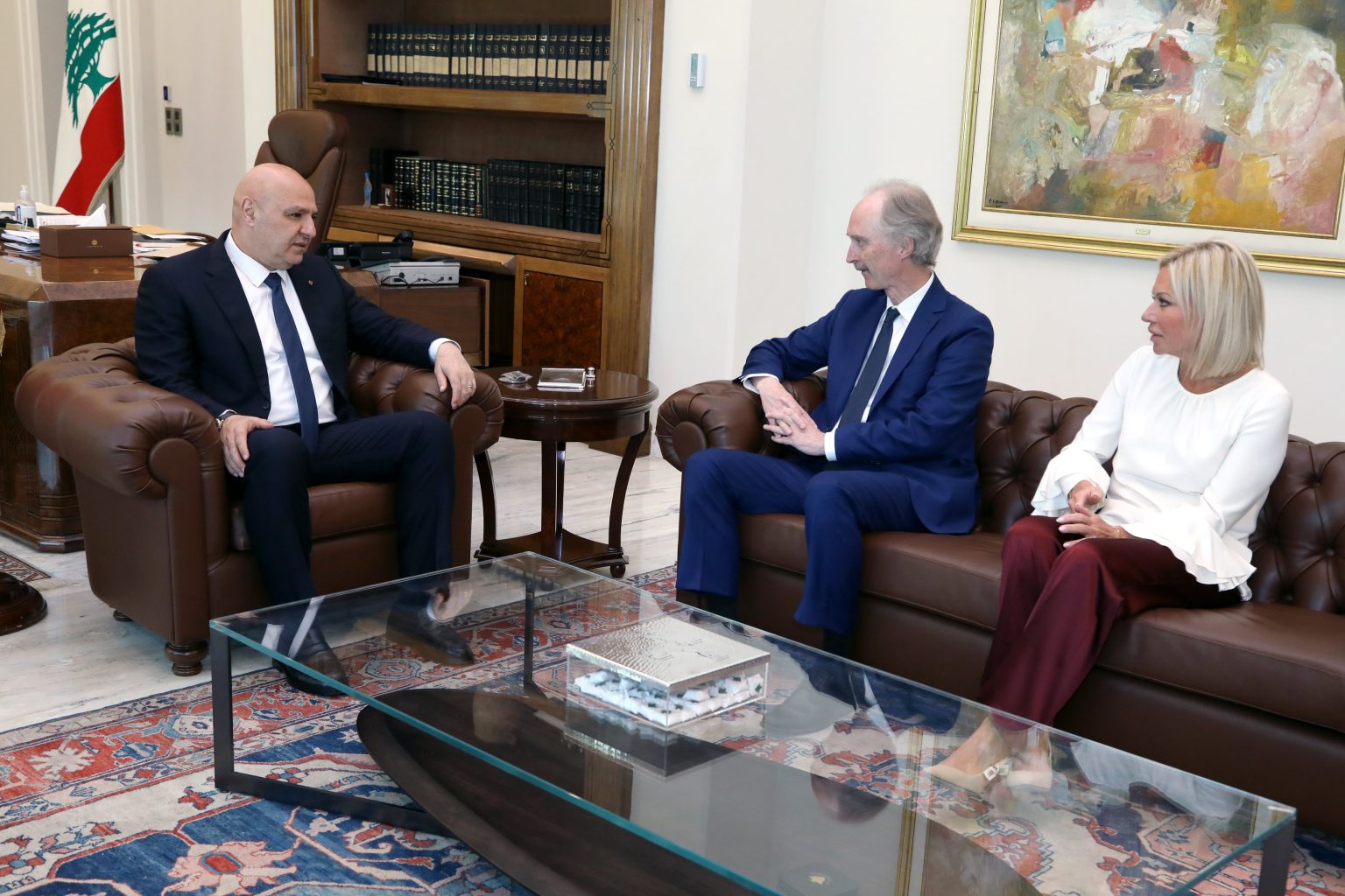 استقبل رئيس الجمهورية العماد جوزاف عون بعد ظهر اليوم الخميس، في قصر بعبدا، المبعوث الخاص للأمم المتحدة الى سوريا غير بيدرسون، والمنسقة الخاصة للأمم المتحدة في لبنان جانين بلاسخارت. واطلع السفير بيدرسون الرئيس عون على الأوضاع في سوريا والعمل الذي تقوم به الأمم المتحدة هناك. وتطرق الحديث الى الوضع على الحدود اللبنانية- السورية وأوضاع النازحين السوريين في لبنان.
