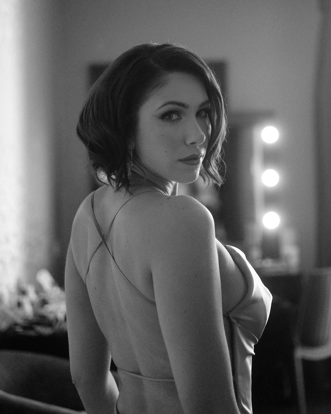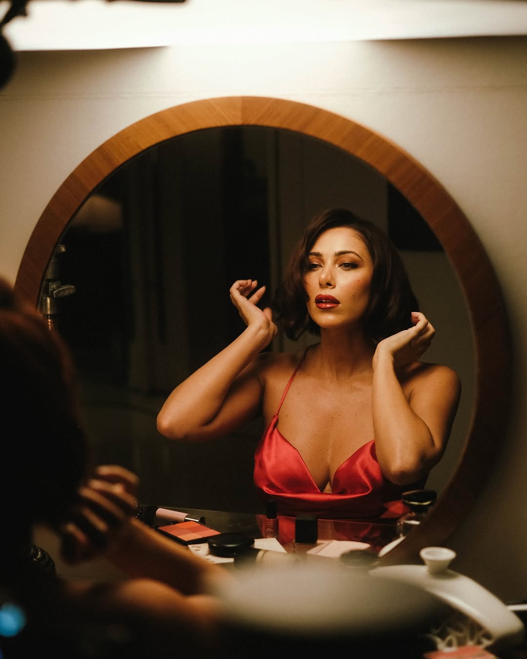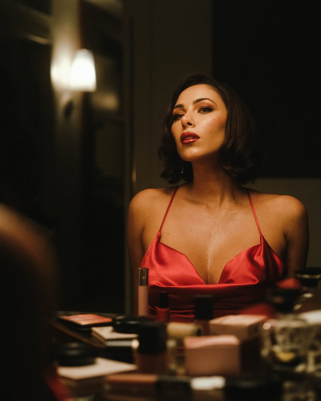 وأطلت دانييلا بفستان أحمر مُثير من الساتان مكشوف الظهر، وبشعر قصير.