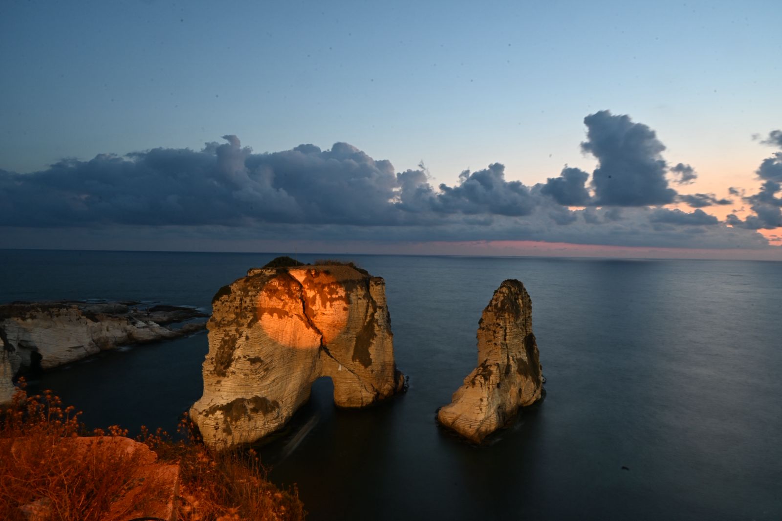 أضيئت صخرة الروشة مساء اليوم بمناسبة “يوم العمل العالمي لمواجهة موجات الحر”.