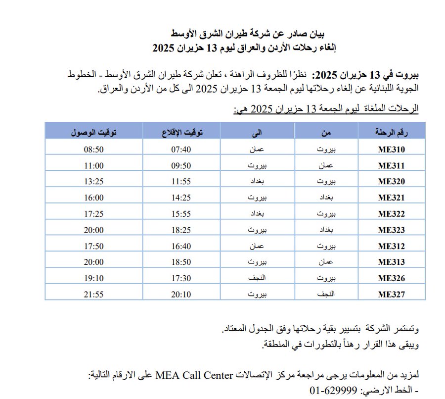 أعلنت شركة طيران الشرق الأوسط في بيان أنه نظرًا للظروف الراهنة ألغت كل رحلاتها اليوم الجمعة 13 حزيران الى كل من الأردن والعراق.