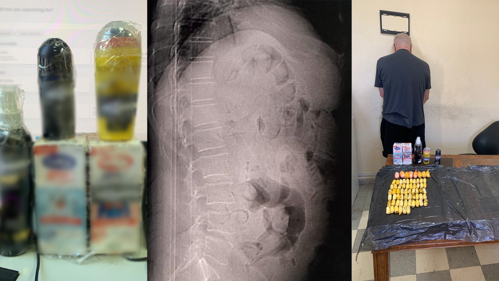 أجريت صورة شعاعيّة لجسم الوافد، حيث تبيّن وجود /65/ كبسولة، بداخلها مادّة الكوكايين، بلغت زنتها /769/غ”.