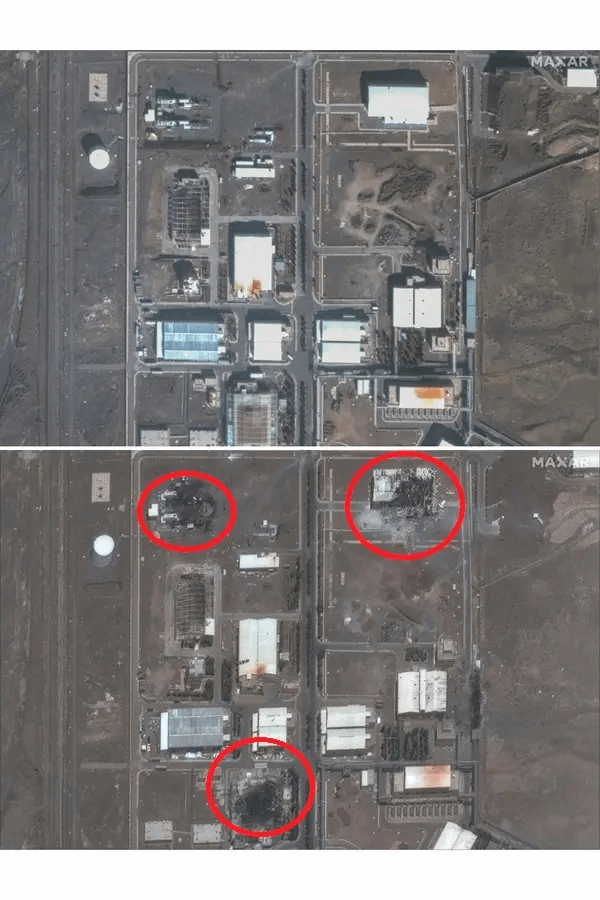 ففي نطنز، يمكن رؤية أضرار لحقت بمنشأة اختبار تخصيب الوقود ومحطة فرعية كهربائية، وتُظهر الصور تعرض عدة مبان لأضرار أو تدمير كامل، بما في ذلك هياكل يقول الخبراء إنها تزود المنشأة بالطاقة.