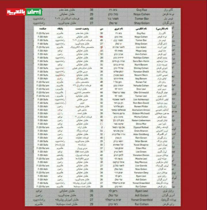 وأشارت الشبكة إلى أن البيانات المسربة تشمل: الاسم الكامل، العمر، الوحدة القتالية، القاعدة الجوية، والدور الميداني لكل طيار، وهي تعد من أكثر المعلومات سرية في المؤسسة العسكرية الصهيونية.
