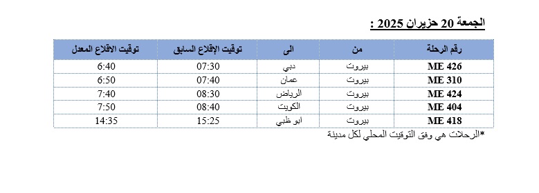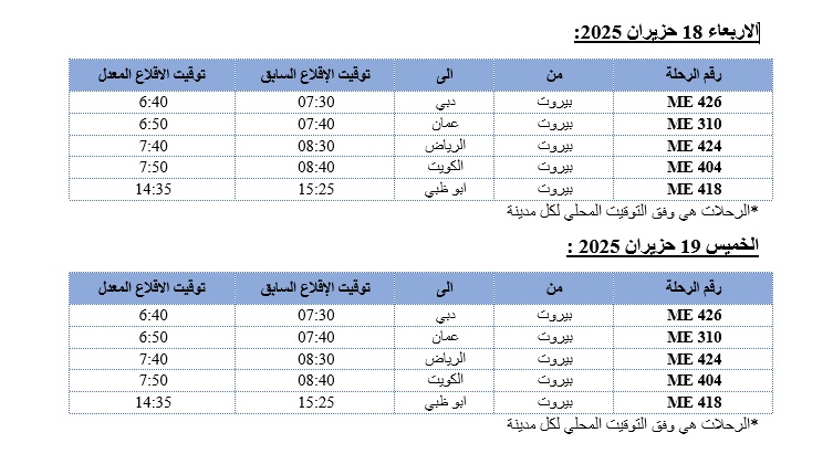 “نظراً للظروف الراهنة وما تفرضه من تغييرات في بعض المسارات الجوية التي ينتج عنها زيادة مدة الرحلات، تعلن شركة طيران الشرق الأوسط – الخطوط الجوية اللبنانية عن تقديم مواعيد إقلاع عدد من رحلاتها المتوجهة من بيروت الى الاردن والخليج العربي خلال الفترة الممتدة من 18 حزيران ولغاية 20 حزيران 2025، وذلك وفقاً للجدول التالي:
