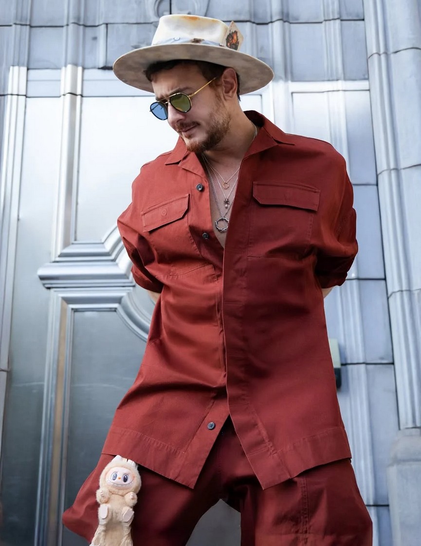 واختار النجم المغربي إطلالة مونوكروم باللون البوردو الفاتح، عبارة عن قميص صيفي بأزرار مع بنطال واسع بقصّة “باغي”، مع جيوب عريضة، والملفت انه استخدم ترند “لابوبو” بطريقة مختلفة، حيث اختار احدى الشخصيات وزين بها بنطاله، في حركة مبتكرة وجديدة.