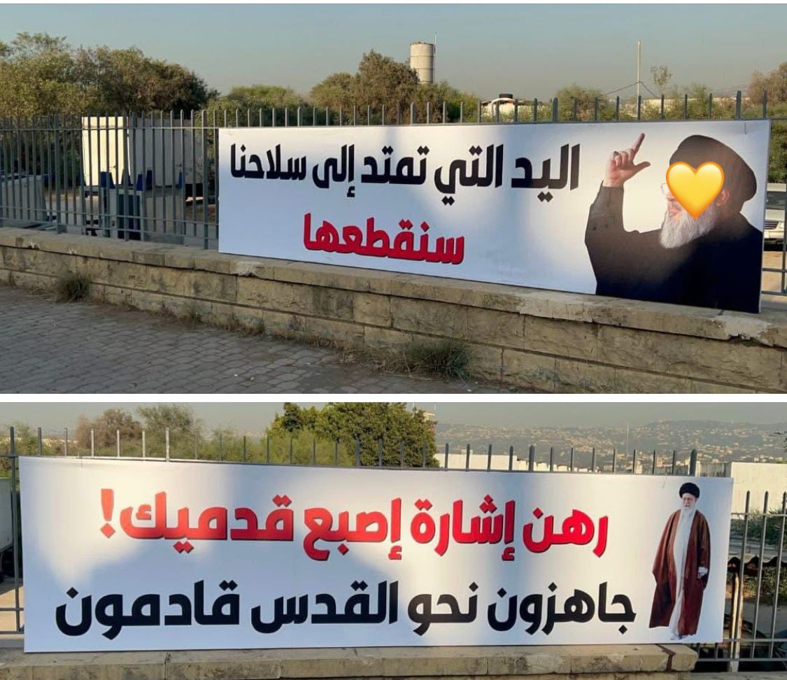 تناقل ناشطون عبر مواقع التواصل الإجتماعي صورة للافتات جرى تعليقها عند مدخل مطار رفيق الحريري الدولي، وقد حملت إحداها صورة للمُرشد الإيراني الأعلى السيد علي خامنئي وأخرى لأمين عام “حزب الله” السابق الشهيد السيد حسن نصرالله.