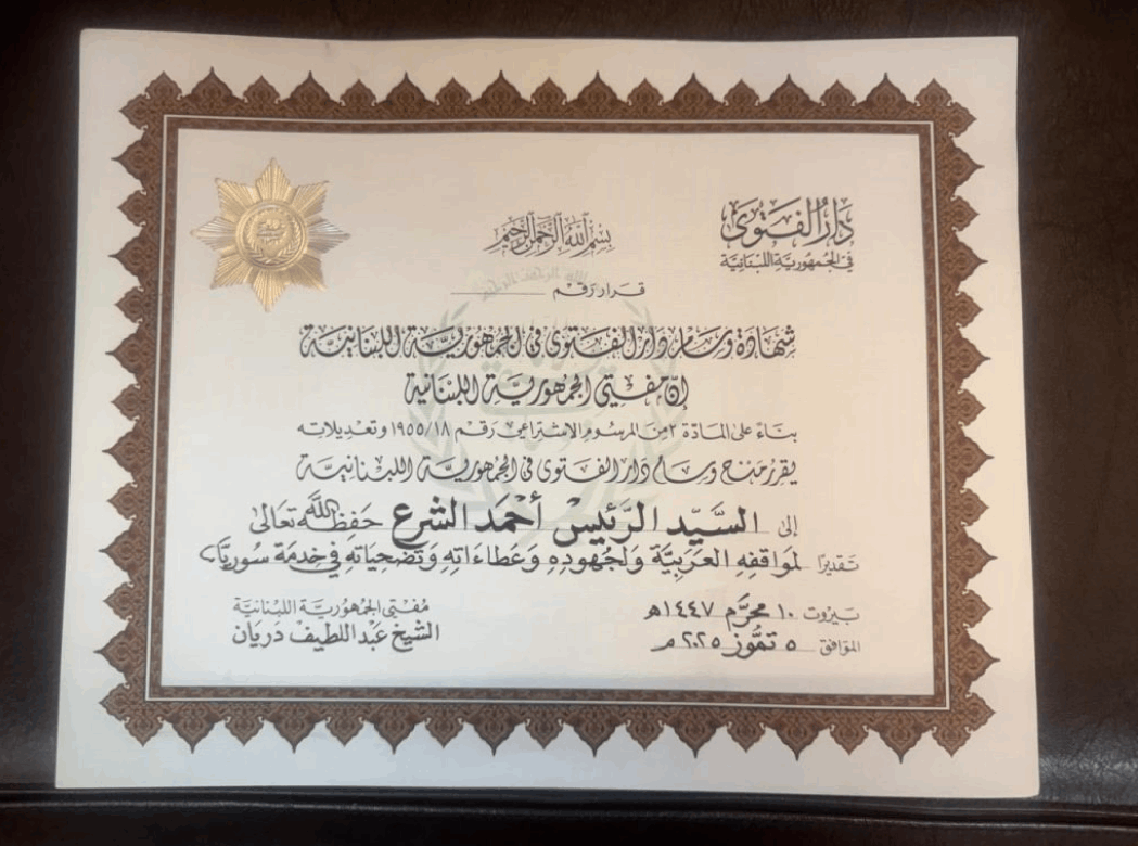 وقدّم المفتي دريان للشرع خلال الزيارة شهادة وسام دار الفتوى الذهبي.