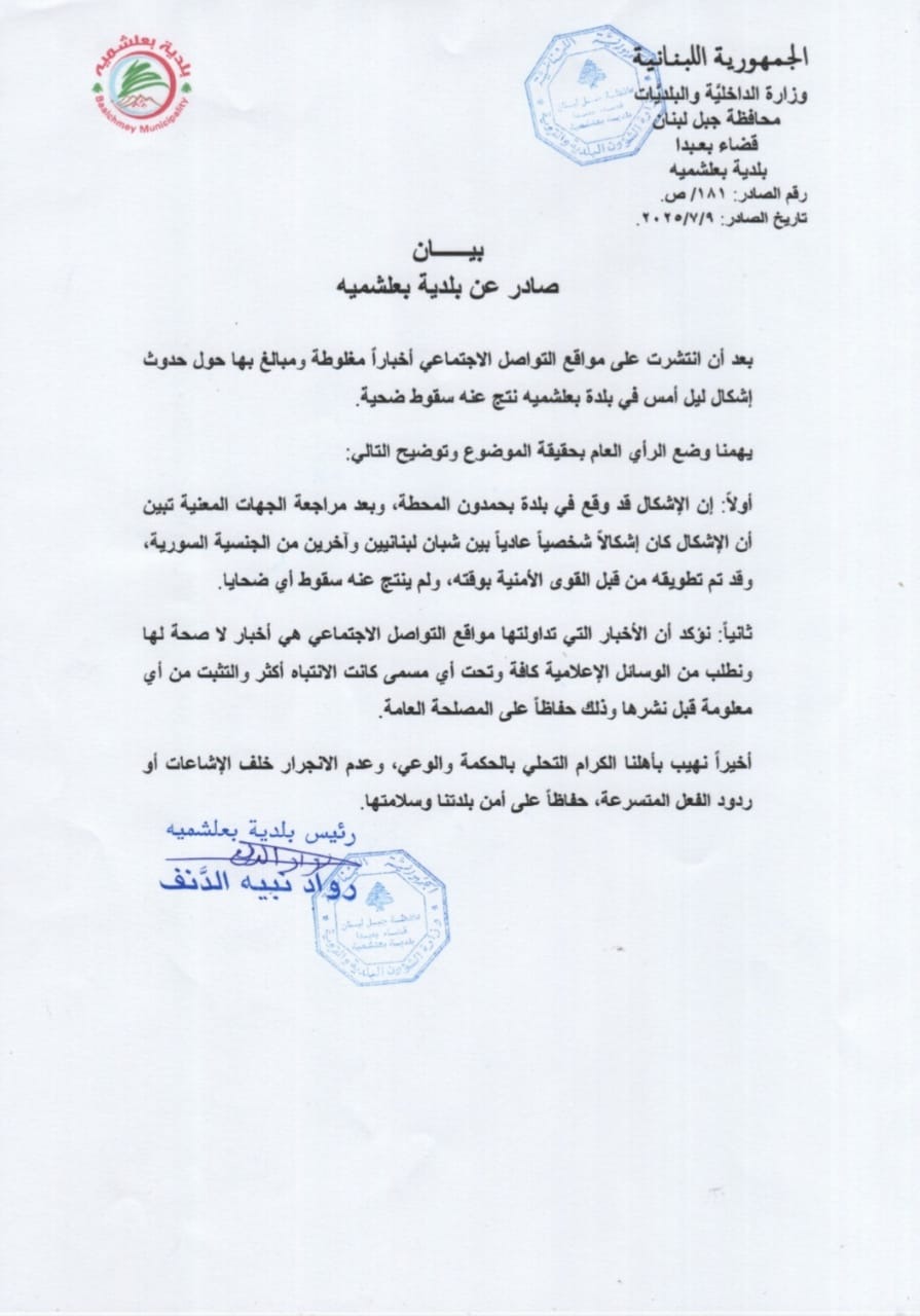 صدر عن بلدية بعلشميه البيان التوضيحي التالي: