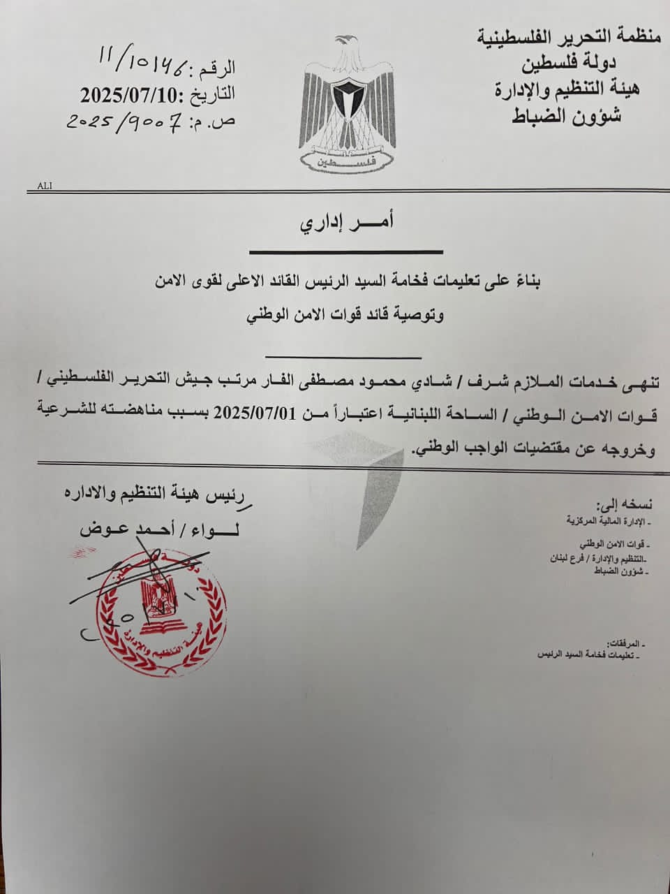 أصدرت منظمة التحرير الفلسطينية قراراً يقضي بإنهاء مهام الملازمين المتمردين في مخيم برج البراجنة.
