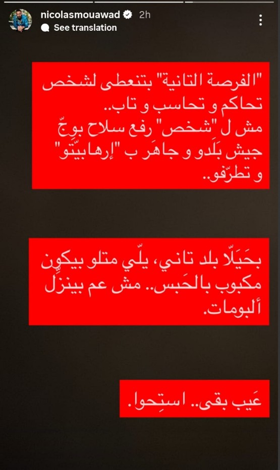 وكتب نيكولا في منشور عبر خاصية “الستوري” على حسابه على تطبيق انستغرام قائلا: “الفرصة التانية” بتنعطي لشخص تحاكم وتحاسب وتاب.. مش لـ “شخص” رفع سلاح بوج جيش بلدو وجاهر بـ “إرهابيتو” وتطرفو”.
