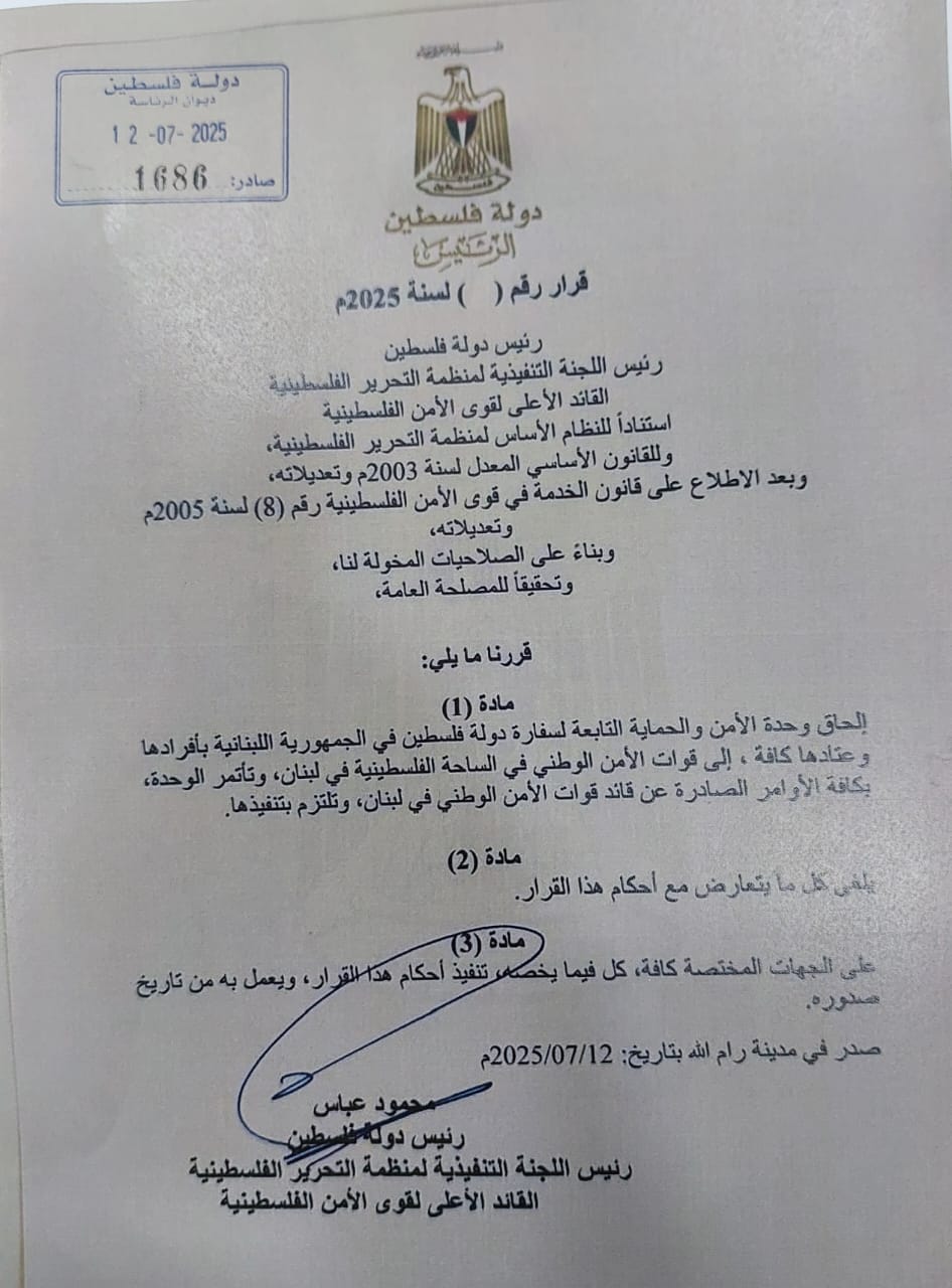 أصدر رئيس السلطة الفلسطينية محمود عباس، اليوم السبت، قراراً جديداً قضى بإلحاق وحدة الأمن والحماية التابعة لسفارة دولة فلسطين في لبنان بأفرادها وعتادها كافة، إلى قوات الأمن الوطني في الساحة الفلسطينية في لبنان.