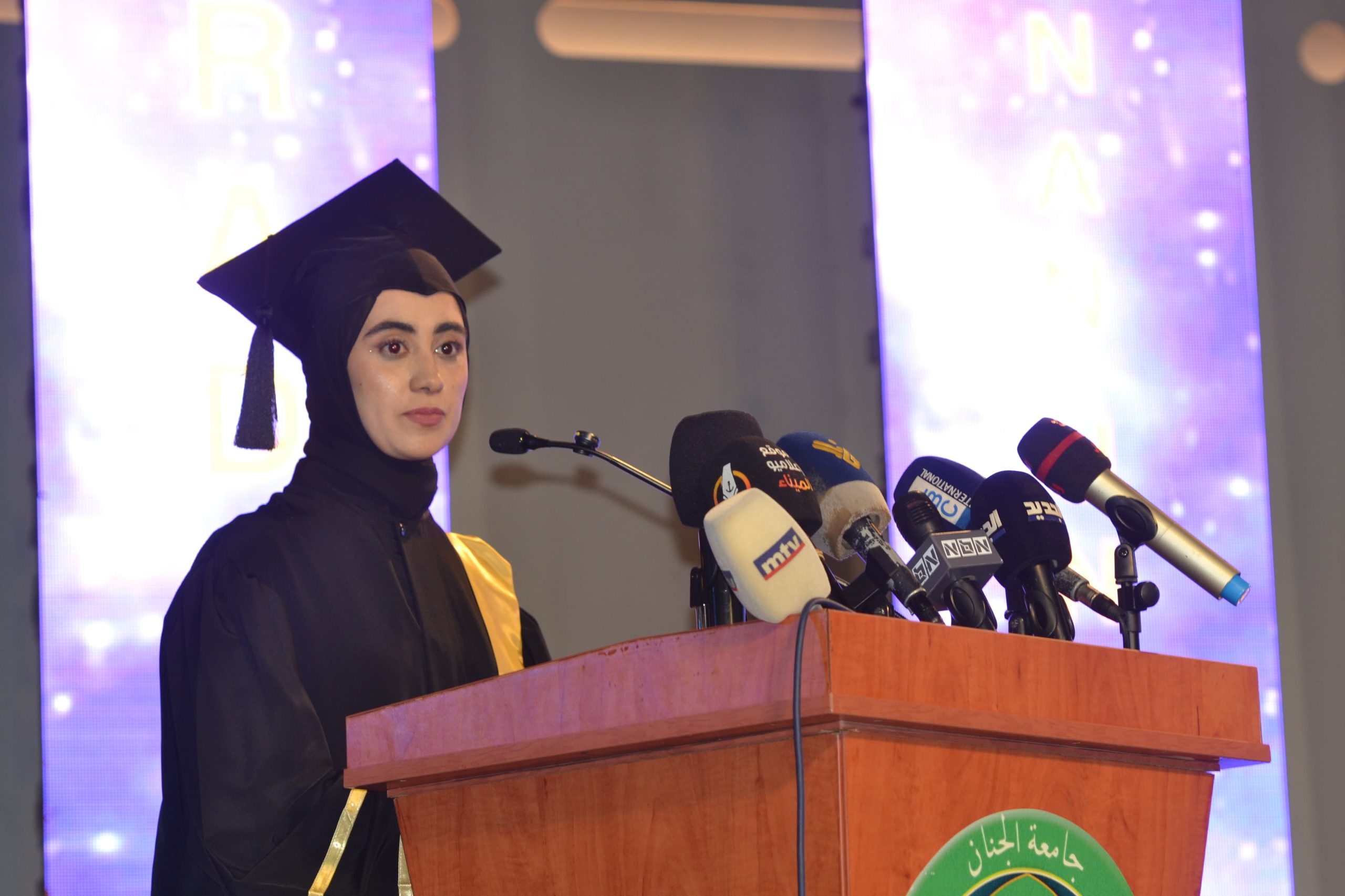 ثمّ ألقت الطالبة منال قرة كلمة الخرّيجين، عبّرت فيها عن مشاعر الامتنان والفخر، وحيّت جامعة الجنان بقولها: “في قاعات الجنان كبرنا، وتعلّمنا ألّا نخشى السؤال. كانت لنا وطنًا صغيرًا تتلاقى فيه الهمم وتُبنى فيه الذات”. وأضافت: “كلّ الأحلام تتحقّق بالسعي والإيمان. لا تتخلّوا عن أحلامكم، فأنتم لم تُخلقوا عبثًا، بل من أجل الخير والتغيير. فلنكن أوفياء لجامعتنا… ولنُباهي بها وتُباهي بنا”.
