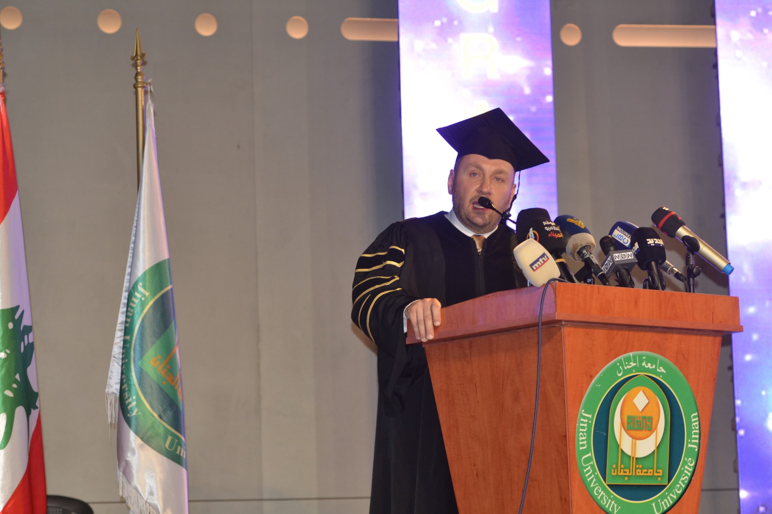 وتوجّه الدكتور يكن بتحيّة تقدير واعتزاز إلى الخرّيجين وأهاليهم، معتبرًا أنّ هذا اليوم لا يُمثّل تتويجًا لمسيرة علميّة فحسب، بل انطلاقةً لمسؤوليّات أعمق تجاه المجتمع والوطن، داعيًا إلى الجمع بين القيم والمِهنيّة في زمن تتسارع فيه التقنيّات وتُختبر فيه الضمائر. واختتم برسالة وفاء دعا فيها الخرّيجين إلى أن يكونوا سفراء لجامعتهم في كلّ الميادين.