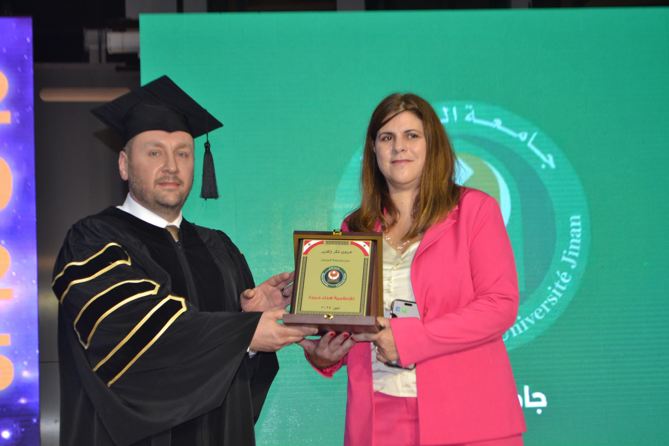 من جانبها، ألقت الإعلاميّة هناء حمزة، الحائزة على جائزة Publisher Excellence Awards – 2025، كلمة جمعيّة الخرّيجين، استعرضت فيها مسيرتها التي انطلقت من جامعة الجنان، مشيرةً إلى أنّها أتاحت لها تحقيق حلم الطفولة بدراسة الإعلام في وقتٍ لم يكن فيه هذا التخصّص متاحًا في شمال لبنان. وقدّمت في كلمتها نصائح ملهمة، دعت من خلالها الخرّيجين إلى احتضان المستقبل بثقة، قائلةً: “أنتم خرّيجو زمن الذكاء الاصطناعيّ، لا تخافوا منه… بل تعلّموا استخدامه بذكاء. الإعلام تغيّر، لكنّ الأخلاق المهنيّة تبقى أساس المهنة”. وختمت برسالة تحفيزيّة: “لا تنتظروا الفرصة، اصنعوها. ولا تخافوا من الفشل، لأنّه مرحلة. أنتم دفعة فتحت الطريق، دفعة إرادة وأمل”.