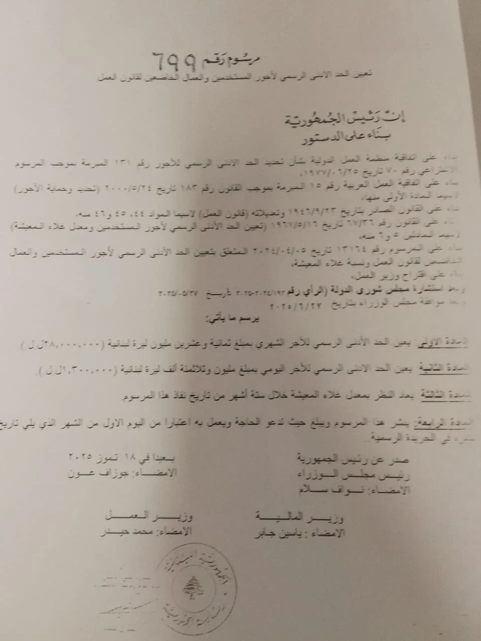 21JUL بالصورة.. عون يوقع على مرسوم الحد الأدنى للأجور Share Tweet Share Whatsapp Email وقّع رئيس الجمهورية العماد جوزيف عون مرسومًا يحدد الحد الأدنى الرسمي للأجور في القطاع الخاص. Related Postsاجتماع موسع في السراي لمتابعة التلوّث المزمن في نهر الليطاني وبحيرة القرعونعون: لا قدرة لأحد على تحمل اندلاع الحرب Post Author: SafirAlChamal